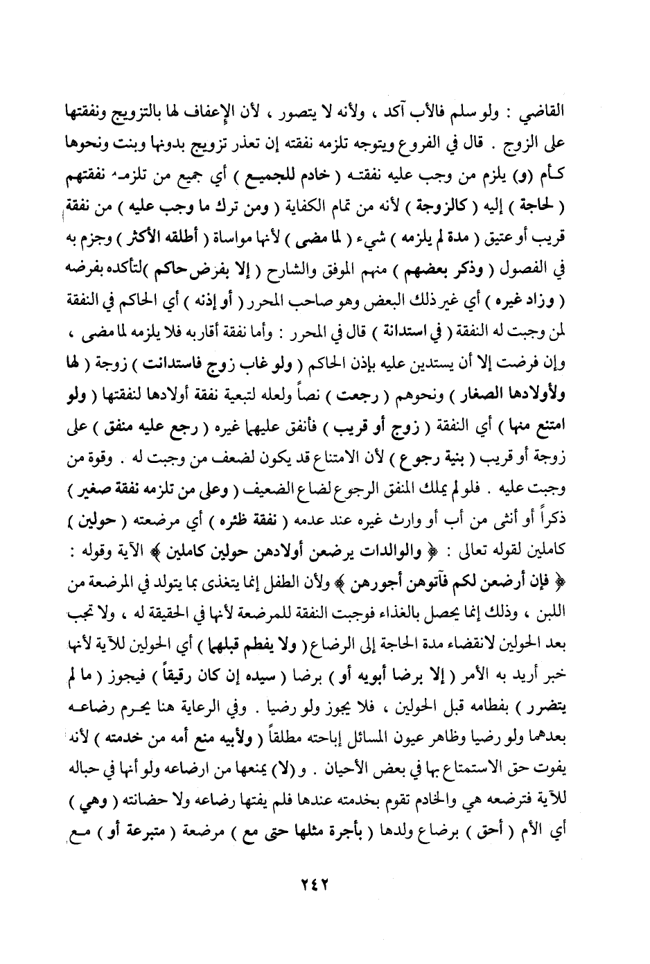 (وَمَنْ تَرَكَ مَا وَجَبَ عَلَيْهِ) مِنْ نَفَقَةِ قَرِيبٍ أَوْ عَتِيقٍ (مُدَّةً لَمْ يَلْزَمْهُ) شَيْءٌ (لِمَا مَضَى) ; لِأَنَّهَا مُوَاسَاةٌ (أَطْلَقَهُ الْأَكْثَرُ) وَجَزَمَ بِهِ فِي الْفُصُولِ (وَذَكَرَ بَعْضُهُمْ) مِنْهُمْ الْمُوَفَّقُ وَالشَّارِحُ (إلَّا بِفَرْضِ حَاكِمٍ) لِتَأَكُّدِهِ بِفَرْضِهِ (وَزَادَ غَيْرُهُ) أَيْ غَيْرُ ذَلِكَ الْبَعْضِ وَهُوَ صَاحِبُ الْمُحَرَّرِ (أَوْ إذْنِهِ) أَيْ الْحَاكِمِ فِي النَّفَقَةِ لِمَنْ وَجَبَتْ لَهُ النَّفَقَةُ (فِي اسْتِدَانَةٍ) قَالَ فِي الْمُحَرَّرِ: وَأَمَّا نَفَقَةُ أَقَارِبِهِ فَلَا يَلْزَمُهُ لِمَا مَضَى، وَإِنْ فُرِضَتْ إلَّا أَنْ يَسْتَدِينَ عَلَيْهِ بِإِذْنِ الْحَاكِمِ (وَلَوْ غَابَ زَوْجٌ فَاسْتَدَانَتْ) زَوْجَةٌ (لَهَا وَلِأَوْلَادِهَا الصِّغَارِ) وَنَحْوِهِمْ (رَجَعَتْ) نَصًّا وَلَعَلَّهُ لِتَبَعِيَّةِ نَفَقَةِ أَوْلَادِهَا لِنَفَقَتِهَا (وَلَوْ امْتَنَعَ مِنْهَا) أَيْ النَّفَقَةِ (زَوْجٌ أَوْ قَرِيبٌ) فَأَنْفَقَ عَلَيْهِمَا غَيْرُهُ (رَجَعَ عَلَيْهِ مُنْفِقٌ) عَلَى زَوْجَةٍ أَوْ قَرِيبٍ (بِنِيَّةِ رُجُوعٍ) ; لِأَنَّ الِامْتِنَاعَ قَدْ يَكُونُ لِضَعْفِ مَنْ وَجَبَتْ لَهُ. وَقُوَّةِ مَنْ وَجَبَتْ عَلَيْهِ. فَلَوْ لَمْ يَمْلِكْ الْمُنْفِقُ الرُّجُوعَ لَضَاعَ الضَّعِيفُ (وَعَلَى مَنْ تَلْزَمُهُ نَفَقَةُ صَغِيرٍ) ذَكَرًا أَوْ أُنْثَى مِنْ أَبٍ أَوْ وَارِثِ غَيْرِهِ عِنْدَ عَدَمِهِ (نَفَقَةُ ظِئْرِهِ) أَيْ مُرْضِعَتِهِ (حَوْلَيْنِ) كَامِلَيْنِ لِقَوْلِهِ تَعَالَى: {وَالْوَالِدَاتُ يُرْضِعْنَ أَوْلَادَهُنَّ حَوْلَيْنِ كَامِلَيْنِ} [البقرة: ٢٣٣] الْآيَةَ وَقَوْلِهِ: {فَإِنْ أَرْضَعْنَ لَكُمْ فَآتُوهُنَّ أُجُورَهُنَّ} [الطلاق: ٦] وَلِأَنَّ الطِّفْلَ إنَّمَا يَتَغَذَّى بِمَا يَتَوَلَّدُ فِي الْمُرْضِعَةِ مِنْ اللَّبَنِ، وَذَلِكَ إنَّمَا يَحْصُلُ بِالْغِذَاءِ فَوَجَبَتْ النَّفَقَةُ لِلْمُرْضِعَةِ ; لِأَنَّهَا فِي الْحَقِيقَةِ لَهُ، وَلَا تَجِبُ بَعْدَ الْحَوْلَيْنِ لِانْقِضَاءِ مُدَّةِ الْحَاجَةِ إلَى الرَّضَاعِ (وَلَا يُفْطَمُ قَبْلَهُمَا) أَيْ الْحَوْلَيْنِ لِلْآيَةِ ; لِأَنَّهَا خَبَرٌ أُرِيدَ بِهِ الْأَمْرُ (إلَّا بِرِضَا أَبَوَيْهِ أَوْ) بِرِضَا (سَيِّدِهِ إنْ كَانَ رَقِيقًا) فَيَجُوزُ (مَا لَمْ يَتَضَرَّرْ) بِفِطَامِهِ قَبْلَ الْحَوْلَيْنِ، فَلَا يَجُوزُ وَلَوْ رَضِيَا.