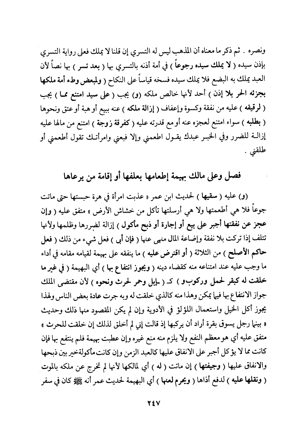 وَعَلَى مَالِكِ بَهِيمَةٍ إطْعَامُهَا بِعَلَفِهَا أَوْ إقَامَةُ مَنْ يَرْعَاهَا (وَ) عَلَيْهِ (سَقْيُهَا) لِحَدِيثِ ابْنِ عُمَرَ " «عُذِّبَتْ امْرَأَةٌ فِي هِرَّةٍ حَبَسَتْهَا حَتَّى مَاتَتْ جُوعًا فَلَا هِيَ أَطْعَمَتْهَا وَلَا هِيَ أَرْسَلَتْهَا تَأْكُلُ مِنْ خَشَاشِ الْأَرْضِ» " مُتَّفَقٌ عَلَيْهِ (وَإِنْ عَجَزَ عَنْ نَفَقَتِهَا أُجْبِرَ عَلَى بَيْعِ أَوْ إجَارَةٍ أَوْ ذَبْحِ مَأْكُولٍ) إزَالَةً لِضَرَرِهَا وَظُلْمِهَا وَلِأَنَّهَا تَتْلَفُ إذَا تُرِكَتْ بِلَا نَفَقَةٍ وَإِضَاعَةُ الْمَالِ مَنْهِيٌّ عَنْهَا (فَإِنْ أَبَى) فِعْلَ شَيْءٍ مِنْ ذَلِكَ (فَعَلَ حَاكِمٌ الْأَصْلَحَ) مِنْ الثَّلَاثَةِ (أَوْ اقْتَرَضَ عَلَيْهِ) مَا يُنْفِقُهُ عَلَى بَهِيمَةٍ لِقِيَامِهِ مَقَامَهُ فِي أَدَاءِ مَا وَجَبَ عَلَيْهِ عِنْدَ امْتِنَاعِهِ مِنْهُ كَقَضَاءِ دَيْنِهِ.