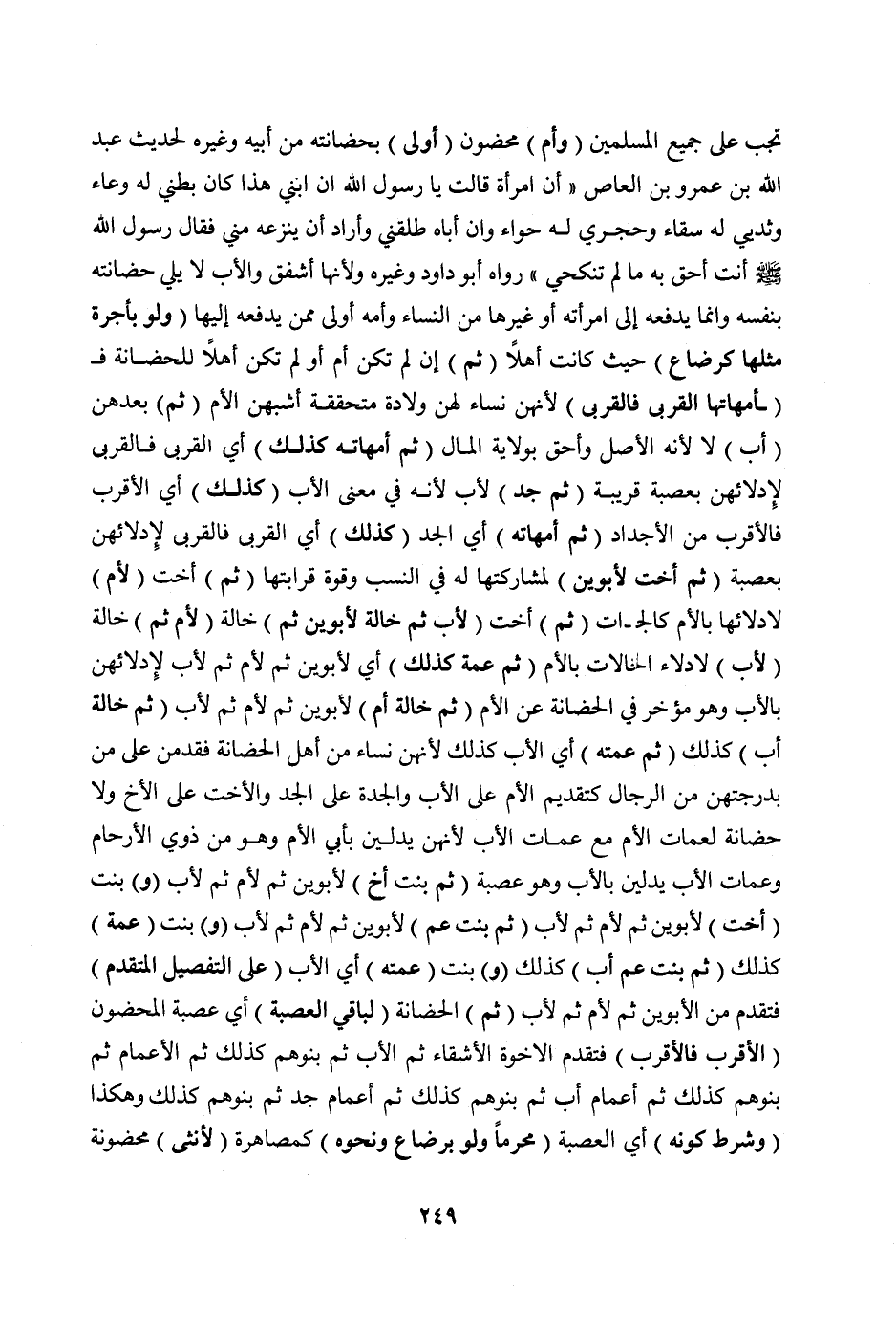 تَجِبُ عَلَى جَمِيعِ الْمُسْلِمِينَ (وَأُمُّ) مَحْضُونٍ (أَوْلَى) بِحَضَانَتِهِ مِنْ أَبِيهِ وَغَيْرِهِ لِحَدِيثِ عَبْدِ اللَّهِ بْنِ عَمْرِو بْنِ الْعَاصِ " «أَنَّ امْرَأَةً قَالَتْ يَا رَسُولَ اللَّهِ إنَّ ابْنِي هَذَا كَانَ بَطْنِي لَهُ وِعَاءً وَثَدْيِي لَهُ سِقَاءً وَحِجْرِي لَهُ حِوَاءً وَإِنَّ أَبَاهُ طَلَّقَنِي وَأَرَادَ أَنْ يَنْزِعَهُ مِنِّي فَقَالَ رَسُولُ اللَّهِ صَلَّى اللَّهُ عَلَيْهِ وَسَلَّمَ أَنْتَ أَحَقُّ بِهِ مَا لَمْ تُنْكَحِي» " رَوَاهُ أَبُو دَاوُد وَغَيْرُهُ وَلِأَنَّهَا أَشْفَقُ، وَالْأَبُ لَا يَلِي حَضَانَتَهُ بِنَفْسِهِ وَإِنَّمَا يَدْفَعُهُ إلَى امْرَأَتِهِ أَوْ غَيْرِهَا مِنْ النِّسَاءِ، وَأُمُّهُ أَوْلَى مِمَّنْ يَدْفَعُهُ إلَيْهَا.