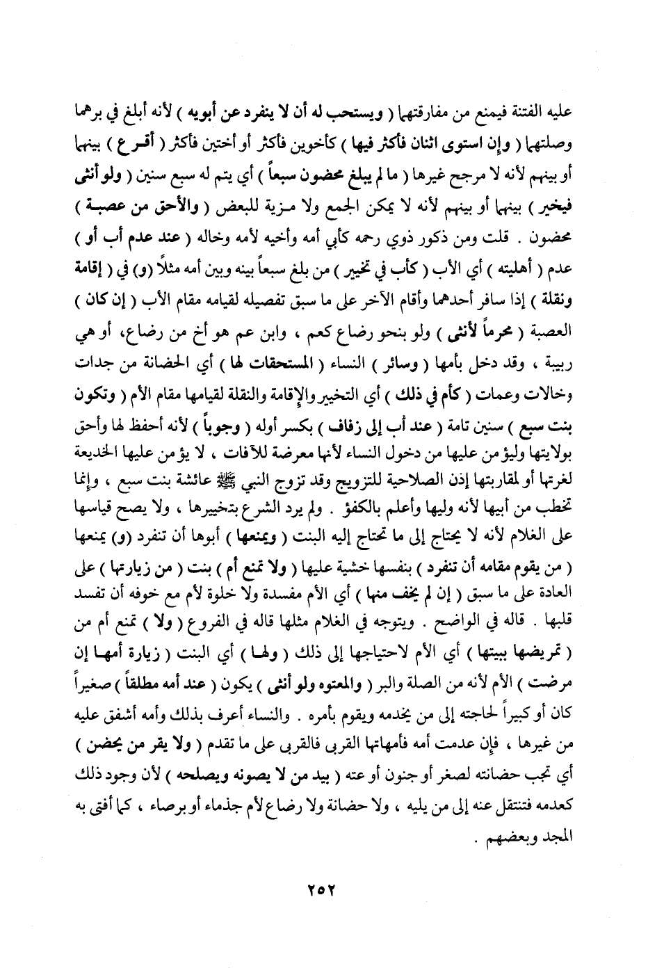 (وَ) فِي (إقَامَةٍ وَنُقْلَةٍ) إذَا سَافَرَ أَحَدُهُمَا وَأَقَامَ الْآخَرُ عَلَى مَا سَبَقَ تَفْصِيلُهُ لِقِيَامِهِ مَقَامَ الْأَبِ (إنْ كَانَ) الْعَصَبَةُ (مَحْرَمًا لِأُنْثَى) وَلَوْ بِنَحْوِ رَضَاعٍ كَعَمٍّ، وَابْنِ عَمٍّ هُوَ أَخٌ مِنْ رَضَاعٍ، أَوْ هِيَ رَبِيبَةٌ، وَقَدْ دَخَلَ بِأُمِّهَا (وَسَائِرُ) النِّسَاءِ (الْمُسْتَحَقَّاتِ لَهَا) أَيْ الْحَضَانَةِ مِنْ جَدَّاتٍ وَخَالَاتٍ وَعَمَّاتٍ (كَأُمٍّ فِي ذَلِكَ) أَيْ التَّخْيِيرِ وَالْإِقَامَةِ وَالنُّقْلَةِ لِقِيَامِهَا مَقَامَ الْأُمِّ.