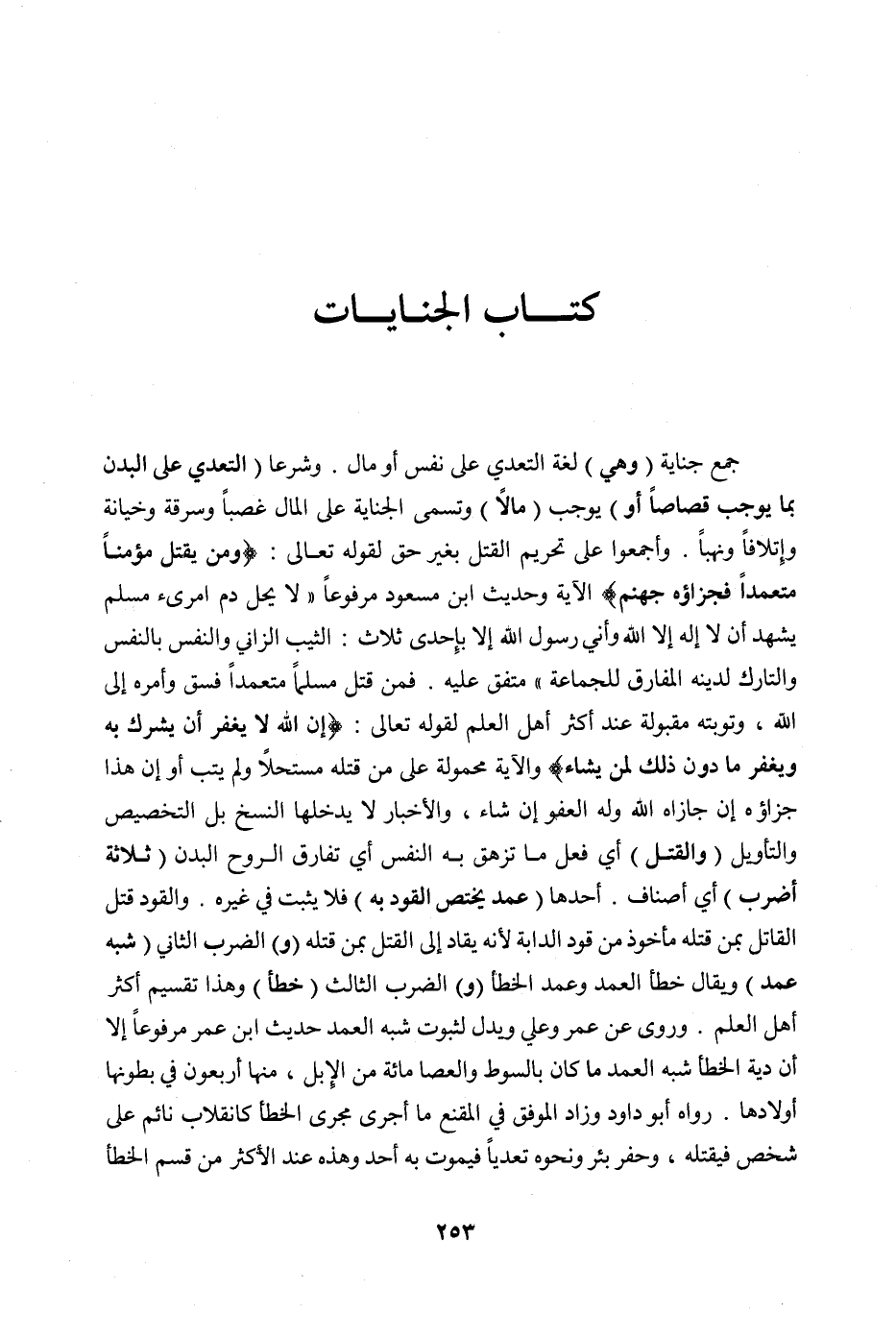 الْجِنَايَاتُ جَمْعُ جِنَايَةٍ (وَهِيَ) لُغَةً: التَّعَدِّي عَلَى نَفْسٍ أَوْ مَالٍ. وَشَرْعًا (التَّعَدِّي عَلَى الْبَدَنِ بِمَا يُوجِبُ قِصَاصًا أَوْ) يُوجِبُ (مَالًا) وَتُسَمَّى الْجِنَايَةُ عَلَى الْمَالِ غَصْبًا وَسَرِقَةً وَخِيَانَةً وَإِتْلَافًا وَنَهْبًا. وَأَجْمَعُوا عَلَى تَحْرِيمِ الْقَتْلِ بِغَيْرِ حَقٍّ لِقَوْلِهِ تَعَالَى {: وَمَنْ يَقْتُلْ مُؤْمِنًا مُتَعَمِّدًا فَجَزَاؤُهُ جَهَنَّمُ} [النساء: ٩٣] الْآيَةَ وَحَدِيثِ ابْنِ مَسْعُودٍ مَرْفُوعًا " «لَا يَحِلُّ دَمُ امْرِئٍ مُسْلِمٍ يَشْهَدُ أَنْ لَا إلَهَ إلَّا اللَّهُ وَأَنِّي رَسُولُ اللَّهِ إلَّا بِإِحْدَى ثَلَاثٍ: الثَّيِّبُ الزَّانِي وَالنَّفْسُ بِالنَّفْسِ وَالتَّارِكُ لِدِينِهِ الْمُفَارِقُ لِلْجَمَاعَةِ» " مُتَّفَقٌ عَلَيْهِ.