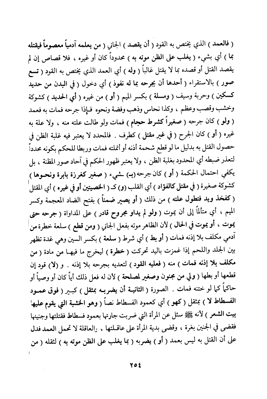 (فَالْعَمْدُ) الَّذِي يَخْتَصُّ بِهِ الْقَوَدُ (أَنْ يَقْصِدَ) الْجَانِي (مَنْ يَعْلَمُهُ آدَمِيًّا مَعْصُومًا فَيَقْتُلَهُ بِمَا) أَيْ بِشَيْءٍ (يَغْلِبُ عَلَى الظَّنِّ مَوْتُهُ بِهِ) مَحْدُودًا كَانَ أَوْ غَيْرَهُ، فَلَا قِصَاصَ إنْ لَمْ يَقْصِدْ الْقَتْلَ أَوْ قَصَدَهُ بِمَا لَا يَقْتُلُ غَالِبًا (وَلَهُ) أَيْ الْعَمْدِ الَّذِي يَخْتَصُّ بِهِ الْقَوَدُ (تِسْعُ صُوَرٍ) بِالِاسْتِقْرَاءِ (أَحَدُهَا أَنْ يَجْرَحَهُ بِمَا لَهُ نُفُوذٌ فِي الْبَدَنِ مِنْ حَدِيدٍ كَسِكِّينٍ) وَحَرْبَةٍ وَسَيْفٍ (وَمِسَلَّةٍ) بِكَسْرِ الْمِيمِ (أَوْ) مِنْ غَيْرِهِ (أَيْ الْحَدِيدِ) كَشَوْكَةٍ وَخَشَبٍ وَقَصَبٍ وَعَظْمٍ، وَكَذَا نُحَاسٌ وَذَهَبٌ وَفِضَّةٌ وَنَحْوُهُ فَإِذَا جَرَحَهُ فَمَاتَ بِهِ فَعَمْدٌ (وَلَوْ) كَانَ جُرْحُهُ (صَغِيرًا كَشَرْطِ حَجَّامٍ) فَمَاتَ وَلَوْ طَالَتْ عِلَّتُهُ مِنْهُ، وَلَا عِلَّةَ بِهِ غَيْرُهُ (أَوْ) كَانَ الْجُرْحُ (فِي غَيْرِ مَقْتَلٍ) كَطَرَفٍ. فَالْمُحَدَّدُ لَا يُعْتَبَرُ فِيهِ غَلَبَةُ الظَّنِّ فِي حُصُولِ الْقَتْلِ بِهِ بِدَلِيلِ مَا لَوْ قَطَعَ شَحْمَةَ أُذُنِهِ أَوْ أُنْمُلَتِهِ فَمَاتَ وَرَبْطًا لِلْحُكْمِ بِكَوْنِهِ مُحَدَّدًا لِتَعَذُّرِ ضَبْطِهِ أَيْ الْمَحْدُودِ بِغَلَبَةِ الظَّنِّ، وَلَا يُعْتَبَرُ ظُهُورُ الْحُكْمِ فِي آحَادِ صُوَرِ الْمَظِنَّةِ، بَلْ يَكْفِي احْتِمَالُ الْحِكْمَةِ (أَوْ) كَانَ جُرْحُهُ (بِ) شَيْءٍ (صَغِيرٍ كَغُرْزَةٍ لِإِبْرَةٍ وَنَحْوِهَا) كَشَوْكَةٍ صَغِيرَةٍ (فِي مَقْتَلٍ كَالْفُؤَادِ) أَيْ الْقَلْبِ.