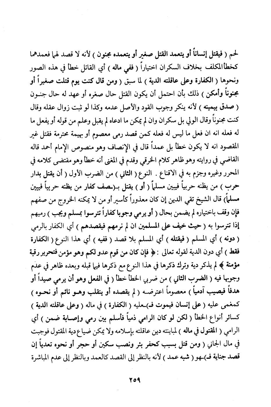 النَّوْعُ (الثَّانِي) مِنْ الضَّرْبِ الْأَوَّلِ (أَنْ يَقْتُلَ بِدَارِ حَرْبٍ) مَنْ يَظُنُّهُ حَرْبِيًّا فَيَبِينَ مُسْلِمًا (أَوْ) يَقْتُلَ بِ (صَفِّ كُفَّارٍ مَنْ يَظُنُّهُ حَرْبِيًّا فَيَبِينَ مُسْلِمًا) قَالَ الشَّيْخُ تَقِيُّ الدِّينِ إنْ كَانَ مَعْذُورًا كَأَسِيرٍ أَوْ مَنْ لَا يُمْكِنُهُ الْخُرُوجُ مِنْ صَفِّهِمْ فَإِنْ وَقَفَ بِاخْتِيَارِهِ لَمْ يَضْمَنْ بِحَالٍ (أَوْ يَرْمِيَ وُجُوبًا كُفَّارًا تَتَرَّسُوا بِمُسْلِمٍ وَيَجِبُ) رَمْيُهُمْ إذَا تَتَرَّسُوا بِهِ (حَيْثُ خِيفَ عَلَى الْمُسْلِمِينَ إنْ لَمْ نَرْمِهِمْ فَيَقْصِدَهُمْ) أَيْ الْكُفَّارَ بِالرَّمْيِ (دُونَهُ) أَيْ الْمُسْلِمِ (فَيَقْتُلَهُ) أَيْ الْمُسْلِمَ بِلَا قَصْدٍ (فَفِيهِ) أَيْ هَذَا النَّوْعِ (الْكَفَّارَةُ فَقَطْ) أَيْ دُونَ الدِّيَةِ لِقَوْلِهِ تَعَالَى: {فَإِنْ كَانَ مِنْ قَوْمٍ عَدُوٍّ لَكُمْ وَهُوَ مُؤْمِنٌ فَتَحْرِيرُ رَقَبَةٍ مُؤْمِنَةٍ} [النساء: ٩٢] لَمْ يَذْكُرْ دِيَةً، وَتَرْكُ ذِكْرِهَا فِي هَذَا النَّوْعِ مَعَ ذِكْرِهَا فِيمَا قَبْلَهُ وَبَعْدَهُ ظَاهِرٌ فِي عَدَمِ وُجُوبِهَا فِيهِ