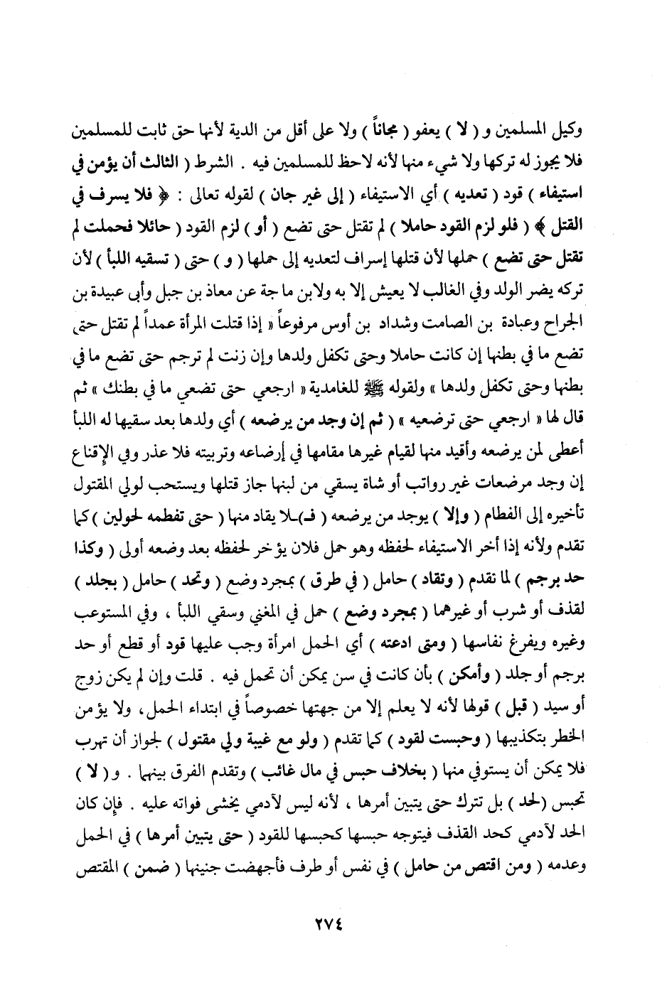 (وَإِلَّا) يُوجَدْ مَنْ يُرْضِعُهُ (فَ) لَا يُقَادُ مِنْهَا (حَتَّى تَفْطِمَهُ لِحَوْلَيْنِ) كَمَا تَقَدَّمَ وَلِأَنَّهُ إذَا أُخِّرَ الِاسْتِيفَاءُ لِحِفْظِهِ وَهُوَ حَمْلٌ فَلَأَنْ يُؤَخَّرَ لِحِفْظِهِ بَعْدَ وَضْعِهِ أَوْلَى (وَكَذَا حَدٌّ بِرَجْمٍ) لِمَا تَقَدَّمَ (وَتُقَادُ) حَامِلٌ (فِي طُرُقٍ) بِمُجَرَّدِ وَضْعٍ (وَتُحَدُّ) حَامِلٌ (بِجَلْدٍ) لِقَذْفٍ أَوْ شُرْبٍ أَوْ غَيْرِهِمَا (بِمُجَرَّدِ وَضْعِ) حَمْلٍ فِي الْمُغْنِي وَسَقْيِ اللِّبَإِ.