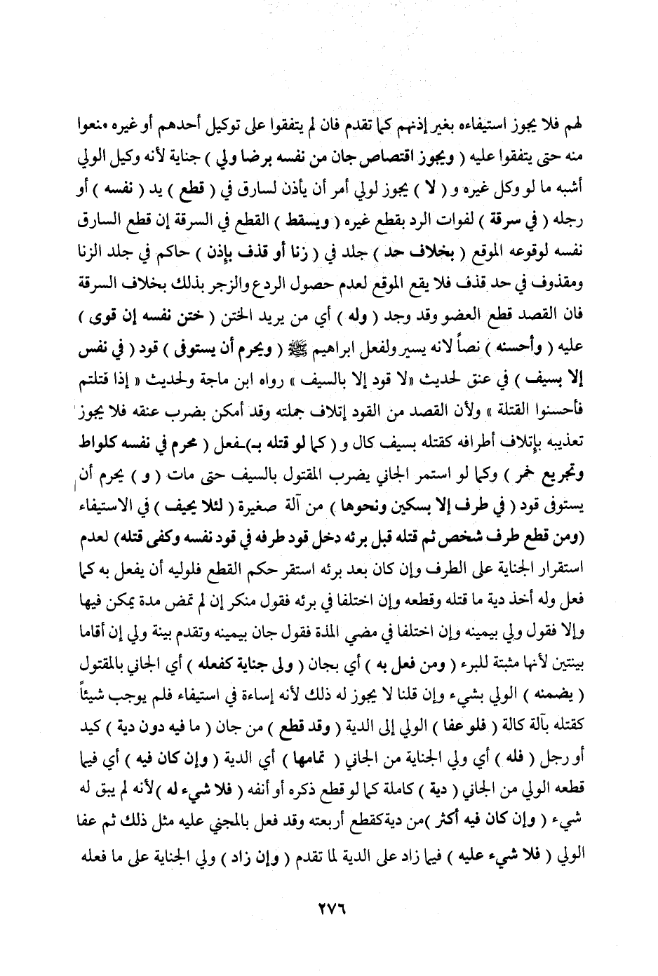 (وَيَحْرُمُ أَنْ يُسْتَوْفَى) قَوَدٌ (فِي نَفْسٍ إلَّا بِسَيْفٍ) فِي عُنُقٍ لِحَدِيثِ " «لَا قَوَدَ إلَّا بِالسَّيْفِ» " رَوَاهُ ابْنُ مَاجَهْ وَلِحَدِيثِ " «إذَا قَتَلْتُمْ فَأَحْسِنُوا الْقِتْلَةَ» " وَلِأَنَّ الْقَصْدَ مِنْ الْقَوَدِ إتْلَافُ جُمْلَتِهِ وَقَدْ أَمْكَنَ بِضَرْبِ عُنُقِهِ فَلَا يَجُوزُ تَعْذِيبُهُ بِإِتْلَافِ أَطْرَافِهِ كَقَتْلِهِ بِسَيْفٍ كَالٍّ وَ (كَمَا لَوْ قَتَلَهُ بِ) فِعْلٍ (مُحَرَّمٍ فِي نَفْسِهِ كَلِوَاطٍ وَتَجْرِيعِ خَمْرٍ) وَكَمَا لَوْ اسْتَمَرَّ الْجَانِي يَضْرِبُ الْمَقْتُولَ بِالسَّيْفِ حَتَّى مَاتَ (وَ) يَحْرُمُ أَنْ يُسْتَوْفَى قَوَدٌ (فِي طَرَفٍ إلَّا بِسِكِّينٍ وَنَحْوِهَا) مِنْ آلَةٍ صَغِيرَةٍ (لِئَلَّا يَحِيفَ) فِي الِاسْتِيفَاءِ (وَمَنْ قَطَعَ طَرَفَ شَخْصٍ ثُمَّ قَتَلَهُ قَبْلَ بُرْئِهِ دَخَلَ قَوَدُ طَرَفِهِ فِي قَوَدِ نَفْسِهِ وَكَفَى قَتْلُهُ) لِعَدَمِ اسْتِقْرَارِ الْجِنَايَةِ عَلَى الطَّرَفِ. وإنْ كَانَ بَعْدَ بُرْئِهِ اسْتَقَرَّ حُكْمُ الْقَطْعِ فَلِوَلِيِّهِ أَنْ يَفْعَلَ بِهِ كَمَا فَعَلَ وَلَهُ أَخْذُ دِيَةِ مَا قَتَلَهُ وَقَطَعَهُ وَإِنْ اخْتَلَفَا فِي بُرْئِهِ فَقَوْلُ مُنْكِرٍ إنْ لَمْ تَمْضِ مُدَّةٌ يُمْكِنُ فِيهَا وَإِلَّا فَقَوْلُ وَلِيٍّ بِيَمِينِهِ وَإِنْ اخْتَلَفَا فِي مُضِيِّ الْمُدَّةِ فَقَوْلُ جَانٍ بِيَمِينِهِ وَتُقَدَّمُ بَيِّنَةُ وَلِيٍّ إنْ أَقَامَا بَيِّنَتَيْنِ ; لِأَنَّهَا مُثَبِّتَةٌ لِلْبُرْءِ (وَمَنْ فَعَلَ بِهِ) أَيْ بِجَانٍ (وَلِيُّ جِنَايَةٍ كَفِعْلِهِ) أَيْ الْجَانِي بِالْمَقْتُولِ (يَضْمَنُهُ) الْوَلِيُّ بِشَيْءٍ وَإِنْ قُلْنَا لَا يَجُوزُ لَهُ ذَلِكَ ; لِأَنَّهُ إسَاءَةٌ فِي اسْتِيفَاءٍ فَلَمْ يُوجِبْ شَيْئًا كَقَتْلِهِ بِآلَةٍ كَالَّةٍ.