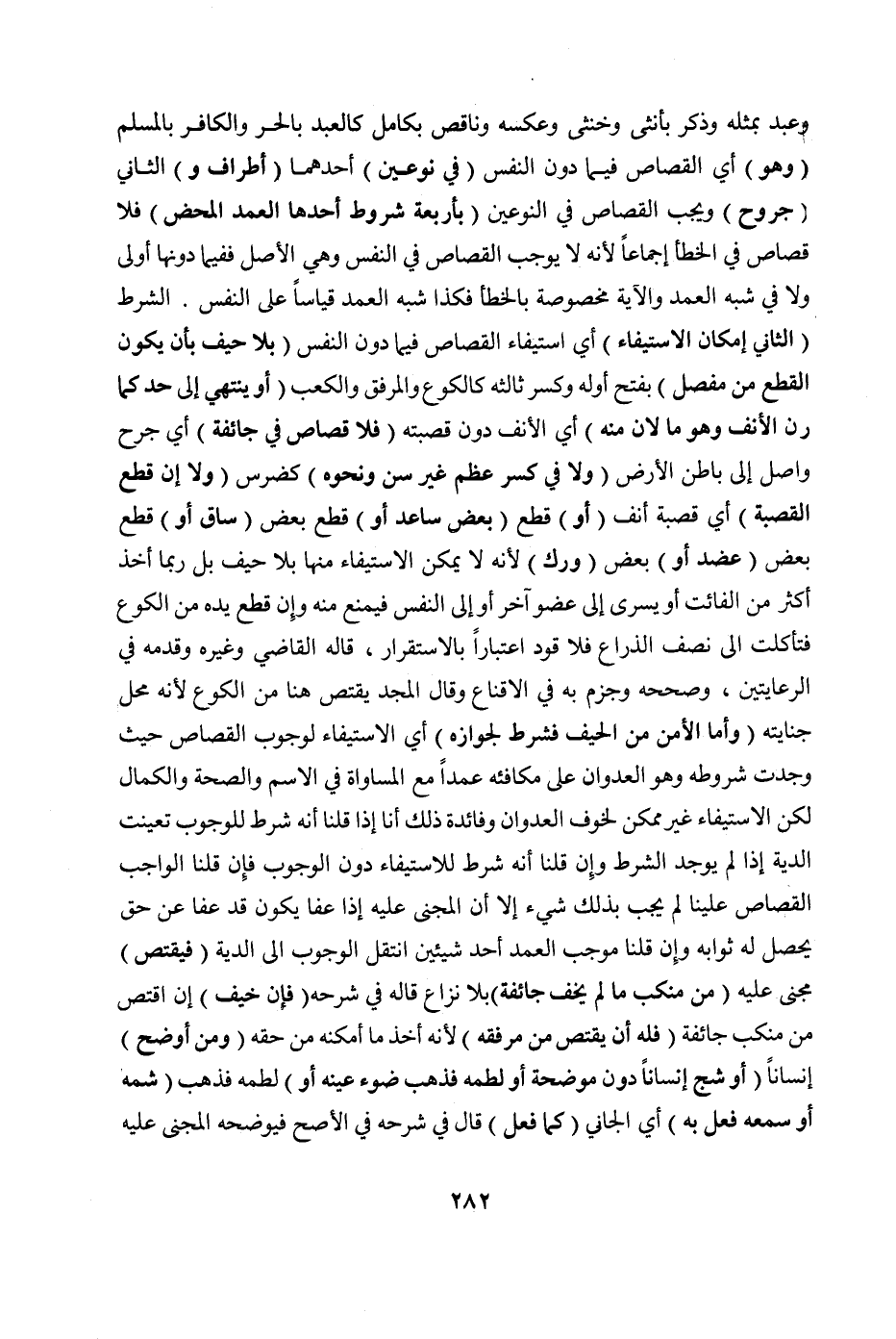 (وَهُوَ) أَيْ الْقِصَاصُ فِيمَا دُونَ النَّفْسِ (فِي نَوْعَيْنِ) أَحَدُهُمَا (أَطْرَافٌ وَ) الثَّانِي (جُرُوحٌ) وَيَجِبُ الْقِصَاصُ فِي النَّوْعَيْنِ (بِأَرْبَعَةِ شُرُوطٍ أَحَدُهَا: الْعَمْدُ الْمَحْضُ) فَلَا قِصَاصَ فِي الْخَطَأِ إجْمَاعًا ; لِأَنَّهُ لَا يُوجِبُ الْقِصَاصَ فِي النَّفْسِ، وَهِيَ الْأَصْلُ فَفِيمَا دُونَهَا أَوْلَى وَلَا فِي شِبْهِ الْعَمْدِ، وَالْآيَةُ مَخْصُوصَةٌ بِالْخَطَأِ فَكَذَا شِبْهُ الْعَمْدِ قِيَاسًا عَلَى النَّفْسِ الشَّرْطُ (الثَّانِي إمْكَانُ الِاسْتِيفَاءِ) أَيْ اسْتِيفَاءِ الْقِصَاصِ فِيمَا دُونَ النَّفْسِ (بِلَا حَيْفٍ بِأَنْ يَكُونَ الْقَطْعُ مِنْ مَفْصِلٍ) بِفَتْحِ أَوَّلِهِ وَكَسْرِ ثَالِثِهِ كَالْكُوعِ وَالْمِرْفَقِ وَالْكَعْبِ (أَوْ يَنْتَهِي إلَى حَدٍّ كَمَارِنِ الْأَنْفِ وَهُوَ مَا لَانَ مِنْهُ) أَيْ الْأَنْفِ دُونَ قَصَبَتِهِ (فَلَا قِصَاصَ فِي جَائِفَةٍ) أَيْ جُرْحٍ وَاصِلٍ إلَى بَاطِنِ الْأَرْضِ (وَلَا فِي كَسْرِ عَظْمٍ غَيْرِ سِنٍّ وَنَحْوَهُ) كَضِرْسٍ (وَلَا إنْ قَطَعَ الْقَصَبَةَ) أَيْ قَصَبَةَ أَنْفٍ (أَوْ) قَطَعَ (بَعْضَ سَاعِدٍ أَوْ) قَطَعَ بَعْضَ (سَاقٍ أَوْ) قَطَعَ بَعْضَ (عَضُدٍ أَوْ) بَعْضَ (وَرِكٍ) ; لِأَنَّهُ لَا يُمْكِنُ الِاسْتِيفَاءُ مِنْهَا بِلَا حَيْفٍ بَلْ رُبَّمَا أَخَذَ أَكْثَرَ مِنْ الْفَائِتِ أَوْ يَسْرِي إلَى عُضْوٍ آخَرَ أَوْ إلَى النَّفْسِ فَيُمْنَعُ مِنْهُ وَإِنْ قَطَعَ يَدَهُ مِنْ الْكُوعِ فَتَآكَلَتْ إلَى نِصْفِ الذِّرَاعِ فَلَا قَوَدَ اعْتِبَارًا بِالِاسْتِقْرَارِ، قَالَهُ الْقَاضِي وَغَيْرُهُ وَقَدَّمَهُ فِي الرِّعَايَتَيْنِ، وَصَحَّحَهُ وَجَزَمَ بِهِ فِي الْإِقْنَاعِ وَقَالَ الْمَجْدُ يُقْتَصُّ هُنَا مِنْ الْكُوعِ ; لِأَنَّهُ مَحَلُّ جِنَايَتِهِ (وَأَمَّا الْأَمْنُ مِنْ الْحَيْفِ فَشَرْطٌ لِجَوَازِهِ) أَيْ الِاسْتِيفَاءِ لِوُجُوبِ الْقِصَاصِ حَيْثُ وُجِدَتْ شُرُوطُهُ وَهُوَ الْعُدْوَانُ عَلَى مُكَافِئِهِ عَمْدًا مَعَ الْمُسَاوَاةِ فِي الِاسْمِ وَالصِّحَّةِ وَالْكَمَالِ لَكِنَّ الِاسْتِيفَاءَ غَيْرُ مُمْكِنٍ لِخَوْفِ الْعُدْوَانِ وَفَائِدَةُ ذَلِكَ أَنَّا إذَا قُلْنَا: إنَّهُ شَرْطٌ لِلْوُجُوبِ تَعَيَّنَتْ الدِّيَةُ إذَا لَمْ يُوجَدْ الشَّرْطُ، وَإِنْ قُلْنَا: إنَّهُ شَرْطٌ لِلِاسْتِيفَاءِ دُونَ الْوُجُوبِ فَإِنْ قُلْنَا: الْوَاجِبُ الْقِصَاصُ عَلَيْنَا لَمْ يَجِبْ بِذَلِكَ شَيْءٌ إلَّا أَنَّ الْمَجْنِيَّ عَلَيْهِ إذَا عَفَا يَكُونُ قَدْ عَفَا عَنْ حَقٍّ يَحْصُلُ لَهُ ثَوَابُهُ وَإِنْ قُلْنَا: مُوجِبُ الْعَمْدِ أَحَدُ شَيْئَيْنِ انْتَقَلَ الْوُجُوبُ إلَى الدِّيَةِ (فَيَقْتَصُّ) مَجْنِيٌّ عَلَيْهِ (مِنْ مَنْكِبٍ مَا لَمْ يَخَفْ جَائِفَةً) بِلَا نِزَاعٍ قَالَ فِي شَرْحِهِ (فَإِنْ خِيفَ) إنْ اقْتَصَّ مِنْ مَنْكِبٍ جَائِفَةً (فَلَهُ أَنْ يَقْتَصَّ مِنْ مِرْفَقِهِ) ; لِأَنَّهُ أَخَذَ مَا أَمْكَنَهُ مِنْ حَقِّهِ