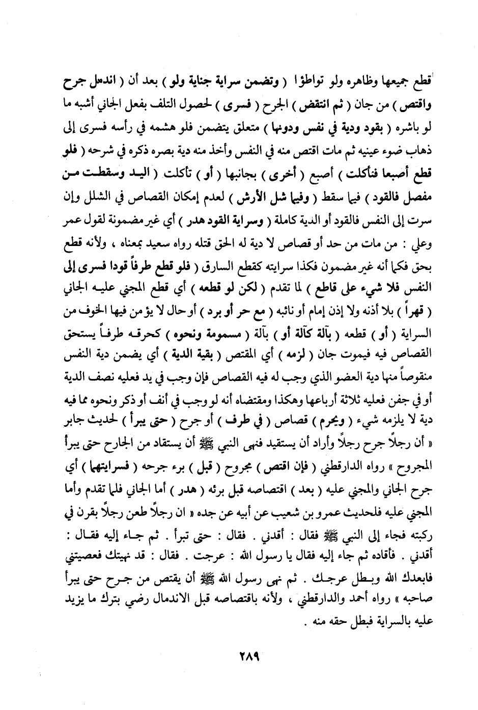 (وَيَحْرُمُ) قِصَاصٌ (فِي طَرَفٍ) أَوْ جُرْحٍ (حَتَّى يَبْرَأَ) لِحَدِيثِ جَابِرٍ «أَنَّ رَجُلًا جَرَحَ رَجُلًا وَأَرَادَ أَنْ يَسْتَقِيدَ فَنَهَى النَّبِيُّ صَلَّى اللَّهُ عَلَيْهِ وَسَلَّمَ أَنْ يُسْتَقَادَ مِنْ الْجَارِحِ حَتَّى يَبْرَأَ الْمَجْرُوحُ» رَوَاهُ الدَّارَقُطْنِيُّ (فَإِنْ اقْتَصَّ) مَجْرُوحٌ (قَبْلَ) بُرْءِ جُرْحِهِ (فَسِرَايَتُهُمَا) أَيْ جُرْحِ الْجَانِي وَالْمَجْنِيِّ عَلَيْهِ (بَعْدَ) اقْتِصَاصِهِ قَبْلَ بُرْئِهِ (هَدَرٌ) أَمَّا الْجَانِي فَلِمَا تَقَدَّمَ وَأَمَّا الْمَجْنِيُّ عَلَيْهِ فَلِحَدِيثِ عَمْرِو بْنِ شُعَيْبٍ عَنْ أَبِيهِ عَنْ جَدِّهِ «أَنَّ رَجُلًا طَعَنَ رَجُلًا بِقَرْنٍ فِي رُكْبَتِهِ فَجَاءَ إلَى النَّبِيِّ صَلَّى اللَّهُ عَلَيْهِ وَسَلَّمَ فَقَالَ: أَقِدْنِي. فَقَالَ: حَتَّى تَبْرَأَ. ثُمَّ جَاءَ إلَيْهِ فَقَالَ: أَقِدْنِي. فَأَقَادَهُ ثُمَّ جَاءَ إلَيْهِ فَقَالَ يَا رَسُولَ اللَّهِ: عَرِجْت. فَقَالَ: قَدْ نَهَيْتُك فَعَصَيْتنِي فَأَبْعَدَك اللَّهُ وَبَطَلَ عَرَجُك. ثُمَّ نَهَى رَسُولُ اللَّهِ صَلَّى اللَّهُ عَلَيْهِ وَسَلَّمَ أَنْ يُقْتَصَّ مِنْ جُرْحٍ حَتَّى يَبْرَأَ صَاحِبُهُ» رَوَاهُ أَحْمَدُ وَالدَّارَقُطْنِيّ، وَلِأَنَّهُ بِاقْتِصَاصِهِ قَبْلَ الِانْدِمَالِ رَضِيَ بِتَرْكِ مَا يَزِيدُ عَلَيْهِ بِالسِّرَايَةِ فَبَطَلَ حَقُّهُ مِنْهُ.