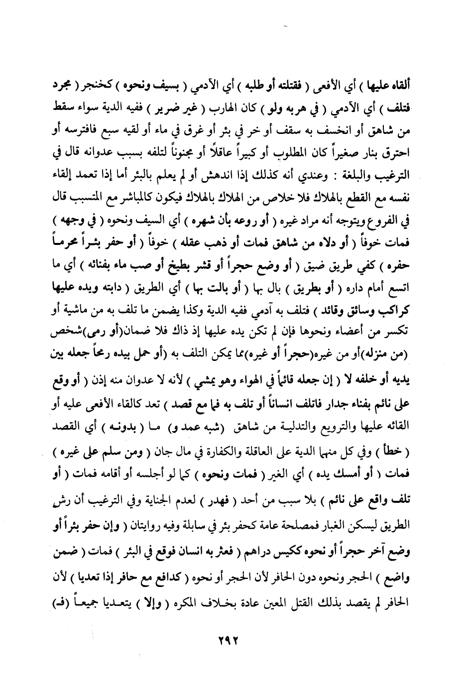 قَالَ فِي الْفُرُوعِ: وَيَتَوَجَّهُ أَنَّهُ مُرَادُ غَيْرِهِ (أَوْ رَوَّعَهُ بِأَنْ شَهْرَهُ) أَيْ: السَّيْفَ وَنَحْوَهُ (فِي وَجْهِهِ) فَمَاتَ خَوْفًا (أَوْ دَلَّاهُ مِنْ شَاهِقٍ فَمَاتَ أَوْ ذَهَبَ عَقْلُهُ) خَوْفًا (أَوْ حَفَرَ بِئْرًا مُحَرَّمًا حَفْرُهُ) كَفِي طَرِيقٍ ضَيِّقٍ (أَوْ وَضَعَ حَجَرًا أَوْ قِشْرَ بِطِّيخٍ أَوْ صَبَّ مَاءً بِفِنَائِهِ) أَيْ مَا اتَّسَعَ أَمَامَ دَارِهِ (أَوْ بِطَرِيقٍ) بَالَ بِهَا (أَوْ بَالَتْ بِهَا) أَيْ الطَّرِيقِ (دَابَّتُهُ وَيَدُهُ عَلَيْهَا كَرَاكِبٍ وَسَائِقٍ وَقَائِدٍ) فَتَلِفَ بِهِ آدَمِيٌّ فَفِيهِ الدِّيَةُ وَكَذَا يَضْمَنُ مَا تَلِفَ بِهِ مِنْ مَاشِيَةٍ أَوْ تَكَسَّرَ مِنْ أَعْضَاءٍ وَنَحْوِهَا فَإِنْ لَمْ تَكُنْ يَدُهُ عَلَيْهَا إذْ ذَاكَ فَلَا ضَمَانَ
