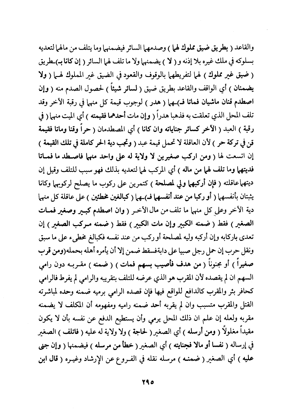 وَالْقَاعِدُ (بِطَرِيقٍ ضَيِّقٍ مَمْلُوكٍ لَهُمَا) وَصَدَمَهُمَا السَّائِرُ فَيَضْمَنُهُمَا وَمَا يَتْلَفُ مِنْ مَالِهِمَا لِتَعَدِّيهِ بِسُلُوكِهِ فِي مِلْكِ غَيْرِهِ بِلَا إذْنِهِ و (لَا) يَضْمَنُهُمَا وَلَا مَا تَلِفَ لَهُمَا السَّائِرُ (إنْ كَانَا ب) طَرِيقٍ (ضَيِّقٍ غَيْرِ مَمْلُوكٍ) لَهُمَا لِتَفْرِيطِهِمَا بِالْوُقُوفِ وَالْقُعُودِ فِي الضَّيِّقِ غَيْرِ الْمَمْلُوكِ لَهُمَا (وَلَا يَضْمَنَانِ) أَيْ الْوَاقِفُ وَالْقَاعِدُ بِطَرِيقٍ ضَيِّقٍ (لِسَائِرٍ شَيْئًا) لِحُصُولِ الصَّدْمِ مِنْهُ