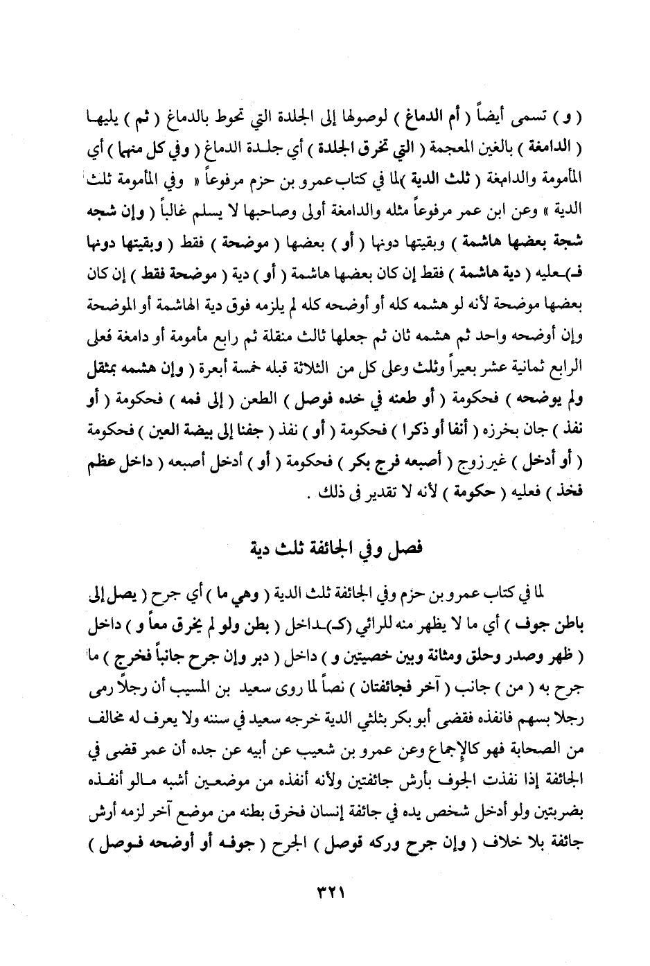 وَفِي الْجَائِفَةِ ثُلُثُ دِيَةٍ لِمَا فِي كِتَابِ عَمْرِو بْنِ حَزْمٍ «وَفِي الْجَائِفَةِ ثُلُثُ الدِّيَةِ» (وَهِيَ مَا) أَيْ: جُرْحٌ (يَصِلُ إلَى بَاطِنِ جَوْفٍ) أَيْ مَا لَا يَظْهَرُ مِنْهُ لِلرَّائِي (كَ) دَاخِلِ (بَطْنٍ وَلَوْ لَمْ يَخْرِقْ مَعًا وَ) دَاخِلِ (ظَهْرٍ وَصَدْرٍ وَحَلْقٍ وَمَثَانَةٍ وَبَيْنَ خُصْيَتَيْنِ وَ) دَاخِلِ (دُبُرٍ وَإِنْ جَرَحَ جَانِبًا فَخَرَجَ) مَا جُرِحَ بِهِ (مِنْ) جَانِبٍ (آخَرَ فَجَائِفَتَانِ) نَصًّا لِمَا رَوَى سَعِيدُ بْنُ الْمُسَيِّبِ أَنَّ رَجُلًا رَمَى رَجُلًا بِسَهْمٍ فَأَنْفَذَهُ فَقَضَى أَبُو بَكْرٍ بِثُلُثَيْ الدِّيَةِ خَرَّجَهُ سَعِيدٌ فِي سُنَنِهِ وَلَا يُعْرَفُ لَهُ مُخَالِفٌ مِنْ الصَّحَابَةِ فَهُوَ كَالْإِجْمَاعِ وَعَنْ عَمْرِو بْنِ شُعَيْبٍ عَنْ أَبِيهِ عَنْ جَدِّهِ أَنَّ عُمَرَ قَضَى فِي الْجَائِفَةِ إذَا نَفَذَتْ الْجَوْفَ بِأَرْشِ جَائِفَتَيْنِ وَلِأَنَّهُ أَنْفَذَهُ مِنْ مَوْضِعَيْنِ أَشْبَهَ مَا لَوْ أَنْفَذَهُ بِضَرْبَتَيْنِ وَلَوْ أَدْخَلَ شَخْصٌ يَدَهُ فِي جَائِفَةِ إنْسَانٍ فَخَرَقَ بَطْنَهُ مِنْ مَوْضِعٍ آخَرَ لَزِمَهُ أَرْشُ جَائِفَةٍ بِلَا خِلَافٍ