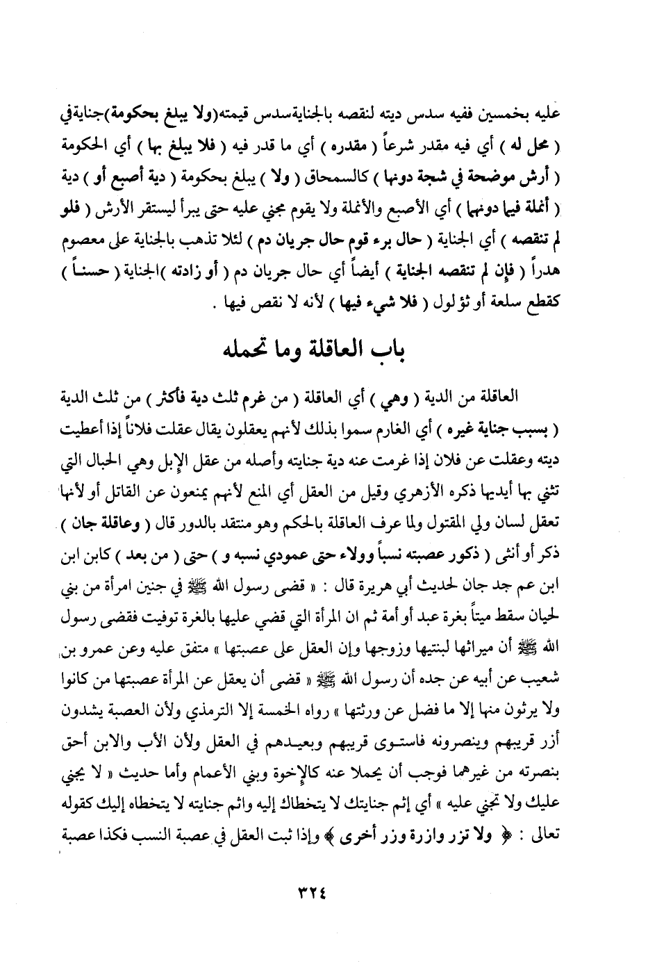 الْعَاقِلَةُ مِنْ الدِّيَةِ (وَهِيَ) أَيْ: الْعَاقِلَةُ (مَنْ غَرِمَ ثُلُثَ دِيَةٍ فَأَكْثَرَ) مِنْ ثُلُثِ الدِّيَةِ (بِسَبَبِ جِنَايَةِ غَيْرِهِ) أَيْ الْغَارِمِ سُمُّوا بِذَلِكَ لِأَنَّهُمْ يَعْقِلُونَ يُقَالُ عَقَلْتُ فُلَانًا إذَا أَعْطَيْتُ دِيَتَهُ، وَعَقَلْتُ عَنْ فُلَانٍ إذَا غَرِمْتُ عَنْهُ دِيَةَ جِنَايَتِهِ، وَأَصْلُهُ مِنْ عَقْلِ الْإِبِلِ وَهِيَ الْحِبَالُ الَّتِي تُثْنَى بِهَا أَيْدِيهَا، ذَكَرَهُ الْأَزْهَرِيُّ وَقِيلَ مِنْ الْعَقْلِ: أَيْ: الْمَنْعِ ; لِأَنَّهُمْ يَمْنَعُونَ عَنْ الْقَاتِلِ أَوْ لِأَنَّهَا تَعْقِلُ لِسَانَ وَلِيِّ الْمَقْتُولِ، وَلَمَّا عَرَّفَ الْعَاقِلَةَ بِالْحُكْمِ وَهُوَ مُنْتَقَدٌ بِالدَّوْرِ قَالَ (وَعَاقِلَةُ جَانٍ) ذَكَرٍ أَوْ أُنْثَى (ذُكُورُ عَصَبَتِهِ نَسَبًا وَوَلَاءً حَتَّى عَمُودَيْ نَسَبِهِ وَ) حَتَّى (مَنْ بَعُدَ) كَابْنِ ابْنِ ابْنِ عَمِّ جَدِّ جَانٍ لِحَدِيثِ أَبِي هُرَيْرَةَ قَالَ: «قَضَى رَسُولُ اللَّهِ صَلَّى اللَّهُ عَلَيْهِ وَسَلَّمَ فِي جَنِينِ امْرَأَةٍ مِنْ بَنِي لِحْيَانَ سَقَطَ مَيْتًا بِغُرَّةِ عَبْدٍ أَوْ أَمَةٍ ثُمَّ إنَّ الْمَرْأَةَ الَّتِي قُضِيَ عَلَيْهَا بِالْغُرَّةِ تُوُفِّيَتْ فَقَضَى رَسُولُ اللَّهِ صَلَّى اللَّهُ عَلَيْهِ وَسَلَّمَ أَنَّ مِيرَاثَهَا لَبِنْتَيْهَا وَزَوْجِهَا وَأَنَّ الْعَقْلَ عَلَى عَصَبَتِهَا» مُتَّفَقٌ عَلَيْهِ.