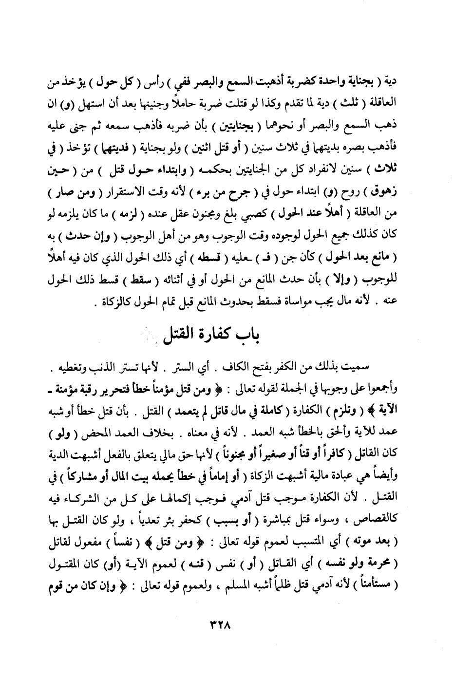كَفَّارَةِ الْقَتْلِ سُمِّيَتْ بِذَلِكَ مِنْ الْكَفْرِ بِفَتْحِ الْكَافِ. أَيْ: السَّتْرِ. لِأَنَّهَا تَسْتُرُ الذَّنْبَ وَتُغَطِّيهِ. وَأَجْمَعُوا عَلَى وُجُوبِهَا فِي الْجُمْلَةِ لِقَوْلِهِ تَعَالَى: {وَمَنْ قَتَلَ مُؤْمِنًا خَطَأً فَتَحْرِيرُ رَقَبَةٍ مُؤْمِنَةٍ} [النساء: ٩٢]- الْآيَةَ (وَتَلْزَمُ) الْكَفَّارَةُ (كَامِلَةً فِي مَالِ قَاتِلٍ لَمْ يَتَعَمَّدْ) الْقَتْلَ. بِأَنْ قَتَلَ خَطَأً أَوْ شِبْهَ عَمْدٍ لِلْآيَةِ وَأُلْحِقَ بِالْخَطَأِ شِبْهُ الْعَمْدِ. لِأَنَّهُ فِي مَعْنَاهُ. بِخِلَافِ الْعَمْدِ الْمَحْضِ (وَلَوْ) كَانَ الْقَاتِلُ (كَافِرًا أَوْ قِنًّا أَوْ صَغِيرًا أَوْ مَجْنُونًا) لِأَنَّهَا حَقٌّ مَالِيٌّ يَتَعَلَّقُ بِالْفِعْلِ أَشْبَهَتْ الدِّيَةَ، وَأَيْضًا هِيَ عِبَادَةٌ مَالِيَّةٌ أَشْبَهَتْ الزَّكَاةَ (أَوْ إمَامًا فِي خَطَأٍ يَحْمِلُهُ بَيْتُ الْمَالِ أَوْ مُشَارِكًا) فِي الْقَتْلِ. لِأَنَّ الْكَفَّارَةَ مُوجِبُ قَتْلِ آدَمِيٍّ فَوَجَبَ إكْمَالُهَا عَلَى كُلٍّ مِنْ الشُّرَكَاءِ فِيهِ كَالْقِصَاصِ، وَسَوَاءٌ قَتَلَ بِمُبَاشَرَةٍ (أَوْ بِسَبَبٍ) كَحَفْرِ بِئْرٍ تَعَدِّيًا، وَلَوْ كَانَ الْقَتْلُ بِهَا (بَعْدَ مَوْتِهِ) أَيْ: الْمُتَسَبِّبِ لِعُمُومِ قَوْله تَعَالَى: {وَمَنْ قَتَلَ} [النساء: ٩٢] (نَفْسًا) مَفْعُولٌ لَقَاتِلٍ (مُحَرَّمَةً وَلَوْ نَفْسَهُ) أَيْ: الْقَاتِلِ (أَوْ) نَفْسَ (قِنِّهِ) لِعُمُومِ الْآيَةِ (أَوْ) كَانَ الْمَقْتُولُ (مُسْتَأْمَنًا) لِأَنَّهُ آدَمِيٌّ قُتِلَ ظُلْمًا أَشْبَهَ الْمُسْلِمَ، وَلِعُمُومِ قَوْله تَعَالَى: