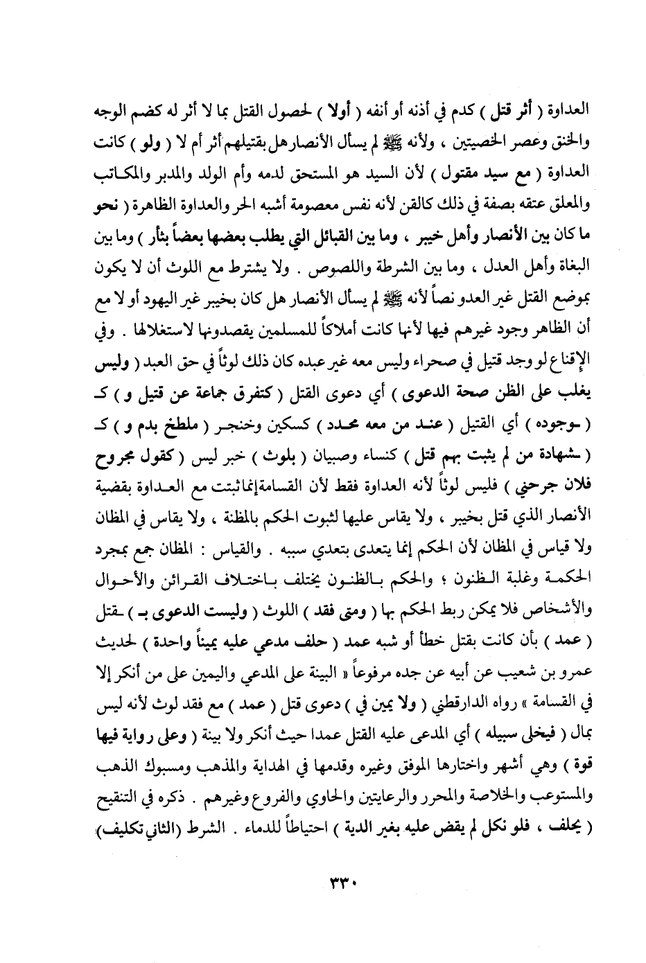 وَفِي الْإِقْنَاعِ لَوْ وُجِدَ قَتِيلٌ فِي صَحْرَاءَ وَلَيْسَ مَعَهُ غَيْرُ عَبْدِهِ كَانَ ذَلِكَ لَوْثًا فِي حَقِّ الْعَبْدِ (وَلَيْسَ يَغْلِبُ عَلَى الظَّنِّ صِحَّةُ الدَّعْوَى) أَيْ: دَعْوَى الْقَتْلِ (كَتَفَرُّقِ جَمَاعَةٍ عَنْ قَتِيلٍ وَ) كَ (وُجُودِهِ) أَيْ: الْقَتِيلِ (عِنْدَ مَنْ مَعَهُ مُحَدَّدٌ) كَسِكِّينٍ وَخِنْجَرٍ (مُلَطَّخٌ بِدَمٍ وَ) كَ (شَهَادَةِ مَنْ لَمْ يَثْبُتْ بِهِمْ قَتْلٌ) كَنِسَاءٍ وَصِبْيَانٍ (بِلَوْثٍ) خَبَرُ لَيْسَ (كَقَوْلِ مَجْرُوحٍ: فُلَانٌ جَرَحَنِي) فَلَيْسَ لَوْثًا لِأَنَّهُ الْعَدَاوَةُ فَقَطْ لِأَنَّ الْقَسَامَةَ إنَّمَا ثَبَتَتْ مَعَ الْعَدَاوَةِ بِقَضِيَّةِ الْأَنْصَارِيِّ الَّذِي قُتِلَ بِخَيْبَرَ، وَلَا يُقَاسُ عَلَيْهَا لِثُبُوتِ الْحُكْمِ بِالْمَظِنَّةِ، وَلَا يُقَاسُ فِي الْمَظَانِّ وَلَا قِيَاسَ فِي الْمَظَانِّ لِأَنَّ الْحُكْمَ إنَّمَا يَتَعَدَّى بِتَعَدِّي سَبَبِهِ. وَالْقِيَاسُ: الْمَظَانُّ جَمْعٌ بِمُجَرَّدِ الْحِكْمَةِ وَغَلَبَةِ الظُّنُونِ ; وَالْحُكْمُ بِالظُّنُونِ يَخْتَلِفُ بِاخْتِلَافِ الْقَرَائِنِ وَالْأَحْوَالِ وَالْأَشْخَاصِ فَلَا يُمْكِنُ رَبْطُ الْحُكْمِ بِهَا (وَمَتَى فُقِدَ) اللَّوْثُ (وَلَيْسَتْ الدَّعْوَى بِ) قَتْلِ (عَمْدٍ) بِأَنْ كَانَتْ بِقَتْلٍ خَطَأٍ أَوْ شِبْهِ عَمْدٍ (حَلَفَ مُدَّعًى عَلَيْهِ يَمِينًا وَاحِدَةً) لِحَدِيثِ عَمْرِو بْنِ شُعَيْبٍ عَنْ أَبِيهِ عَنْ جَدِّهِ مَرْفُوعًا «الْبَيِّنَةُ عَلَى الْمُدَّعِي وَالْيَمِينُ عَلَى مَنْ أَنْكَرَ إلَّا فِي الْقَسَامَةِ» رَوَاهُ الدَّارَقُطْنِيُّ (وَلَا يَمِينَ فِي) دَعْوَى قَتْلِ (عَمْدٍ) مَعَ فَقْدِ لَوْثٍ لِأَنَّهُ لَيْسَ بِمَالٍ (فَيُخْلَى سَبِيلُهُ) أَيْ: الْمُدَّعَى عَلَيْهِ الْقَتْلُ عَمْدًا حَيْثُ أَنْكَرَ وَلَا بَيِّنَةَ (وَعَلَى رِوَايَةٍ فِيهَا قُوَّةٌ) وَهِيَ أَشْهُرُ وَاخْتَارَهَا الْمُوَفَّقُ وَغَيْرُهُ وَقَدَّمَهَا فِي الْهِدَايَةِ وَالْمَذْهَبِ وَمَسْبُوكِ الذَّهَبِ وَالْمُسْتَوْعِبِ وَالْخُلَاصَةِ وَالْمُحَرَّرِ وَالرِّعَايَتَيْنِ وَالْحَاوِي وَالْفُرُوعِ وَغَيْرِهِمْ. ذَكَرَهُ فِي التَّنْقِيحِ (يَحْلِفُ، فَلَوْ نَكَلَ لَمْ يَقْضِ عَلَيْهِ بِغَيْرِ الدِّيَةِ) احْتِيَاطًا لِلدِّمَاءِ. الشَّرْطُ (الثَّانِي تَكْلِيفُ)