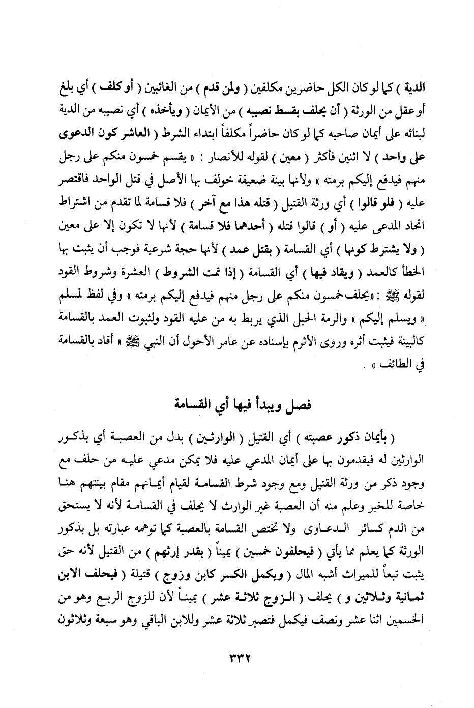 الدِّيَةِ) كَمَا لَوْ كَانَ الْكُلُّ حَاضِرِينَ مُكَلَّفِينَ (وَلِمَنْ قَدِمَ) مِنْ الْغَائِبِينَ (أَوْ كُلِّفَ) أَيْ بَلَغَ أَوْ عَقَلَ مِنْ الْوَرَثَةِ (أَنْ يَحْلِفَ بِقِسْطِ نَصِيبِهِ) مِنْ الْأَيْمَانِ (وَيَأْخُذُهُ) أَيْ: نَصِيبَهُ مِنْ الدِّيَةِ لِبِنَائِهِ عَلَى أَيْمَانِ صَاحِبِهِ كَمَا لَوْ كَانَ حَاضِرًا مُكَلَّفًا ابْتِدَاءً. الشَّرْطُ (الْعَاشِرُ: كَوْنُ الدَّعْوَى عَلَى وَاحِدٍ) لَا اثْنَيْنِ فَأَكْثَرَ (مُعَيَّنٍ) لِقَوْلِهِ لِلْأَنْصَارِ: «يَقْسِمُ خَمْسُونَ مِنْكُمْ عَلَى رَجُلٍ مِنْهُمْ فَيُدْفَعُ إلَيْكُمْ بِرُمَّتِهِ» وَلِأَنَّهَا بَيِّنَةٌ ضَعِيفَةٌ خُولِفَ بِهَا الْأَصْلُ فِي قَتْلِ الْوَاحِدِ فَاقْتَصَرَ عَلَيْهِ (فَلَوْ قَالُوا) أَيْ وَرَثَةُ الْقَتِيلِ (قَتَلَهُ هَذَا مَعَ آخَرَ) فَلَا قَسَامَةَ لِمَا تَقَدَّمَ مِنْ اشْتِرَاطِ اتِّحَادِ الْمُدَّعَى عَلَيْهِ (أَوْ) قَالُوا قَتَلَهُ (أَحَدُهُمَا فَلَا قَسَامَةَ) لِأَنَّهَا لَا تَكُونُ إلَّا عَلَى مُعَيَّنٍ (وَلَا يُشْتَرَطُ كَوْنُهَا) أَيْ الْقَسَامَةِ (بِقَتْلٍ عَمْدٍ) لِأَنَّهَا حُجَّةٌ شَرْعِيَّةٌ فَوَجَبَ أَنْ يَثْبُتَ بِهَا الْخَطَأُ كَالْعَمْدِ. (وَيُقَادُ فِيهَا) أَيْ: الْقَسَامَةِ (إذَا تَمَّتْ الشُّرُوطُ) الْعَشَرَةُ، وَشُرُوطُ الْقَوَدِ لِقَوْلِهِ صَلَّى اللَّهُ عَلَيْهِ وَسَلَّمَ: «يَحْلِفُ خَمْسُونَ مِنْكُمْ عَلَى رَجُلٍ مِنْهُمْ فَيُدْفَعُ إلَيْكُمْ بِرُمَّتِهِ» .