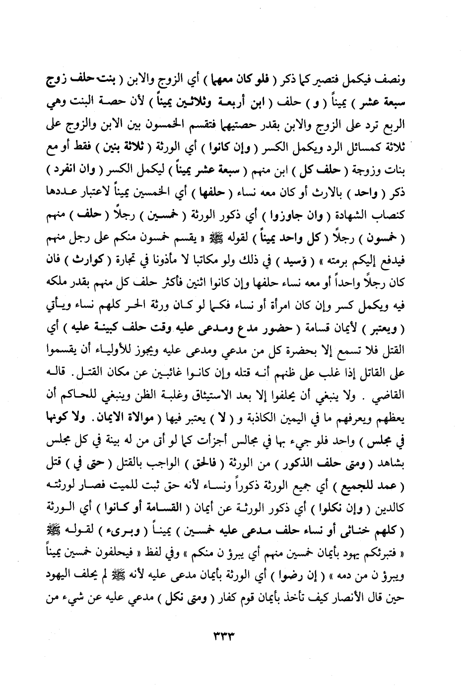 وَنِصْفٌ فَيَكْمُلُ فَتَصِيرُ كَمَا ذَكَرَ (فَلَوْ كَانَ مَعَهُمَا) أَيْ: الزَّوْجِ وَالِابْنِ (بِنْتٌ حَلَفَ زَوْجٌ سَبْعَةَ عَشَرَ) يَمِينًا (وَ) حَلَفَ (ابْنٌ أَرْبَعَةً وَثَلَاثِينَ يَمِينًا) لِأَنَّ حِصَّةَ الْبِنْتِ وَهِيَ الرُّبُعُ تُرَدُّ عَلَى الزَّوْجِ وَالِابْنِ بِقَدْرِ حِصَّتَيْهِمَا فَتُقْسَمُ الْخَمْسُونَ بَيْنَ الِابْنِ وَالزَّوْجِ عَلَى ثَلَاثَةٍ كَمَسَائِلِ الرَّدِّ وَيُكْمَلُ الْكَسْرُ (وَإِنْ كَانُوا) أَيْ: الْوَرَثَةُ (ثَلَاثَةَ بَنِينَ) فَقَطْ أَوْ مَعَ بَنَاتِ وَزَوْجَةٍ (حَلَفَ كُلُّ) ابْنٍ مِنْهُمْ (سَبْعَةَ عَشَرَ يَمِينًا) لِيَكْمُلَ الْكَسْرُ (وَإِنْ انْفَرَدَ) ذَكَرٌ (وَاحِدٌ) بِالْإِرْثِ أَوْ كَانَ مَعَهُ نِسَاءٌ (حَلَفَهَا) أَيْ: الْخَمْسِينَ يَمِينًا لِاعْتِبَارِ عَدَدِهَا كَنِصَابِ الشَّهَادَةِ (وَإِنْ جَاوَزُوا) أَيْ: ذُكُورُ الْوَرَثَةِ (خَمْسِينَ) رَجُلًا (حَلَفَ) مِنْهُمْ (خَمْسُونَ) رَجُلًا (كُلُّ وَاحِدٍ يَمِينًا) لِقَوْلِهِ صَلَّى اللَّهُ عَلَيْهِ وَسَلَّمَ «يَقْسِمُ خَمْسُونَ مِنْكُمْ عَلَى رَجُلٍ مِنْهُمْ فَيُدْفَعُ إلَيْكُمْ بِرُمَّتِهِ» (وَسَيِّدٌ) فِي ذَلِكَ وَلَوْ مُكَاتِبًا لَا مَأْذُونًا فِي تِجَارَةٍ (كَوَارِثٍ) فَإِنْ كَانَ رَجُلًا وَاحِدًا أَوْ مَعَهُ نِسَاءٌ حَلَفَهَا وَإِنْ كَانُوا اثْنَيْنِ فَأَكْثَرَ حَلَفَ كُلٌّ مِنْهُمْ بِقَدْرِ مِلْكِهِ فِيهِ، وَيُكْمَلُ كَسْرٌ، وَإِنْ كَانَ امْرَأَةً أَوْ نِسَاءً فَكَمَا لَوْ كَانَ وَرَثَةُ الْحُرِّ كُلُّهُمْ نِسَاءً وَيَأْتِي