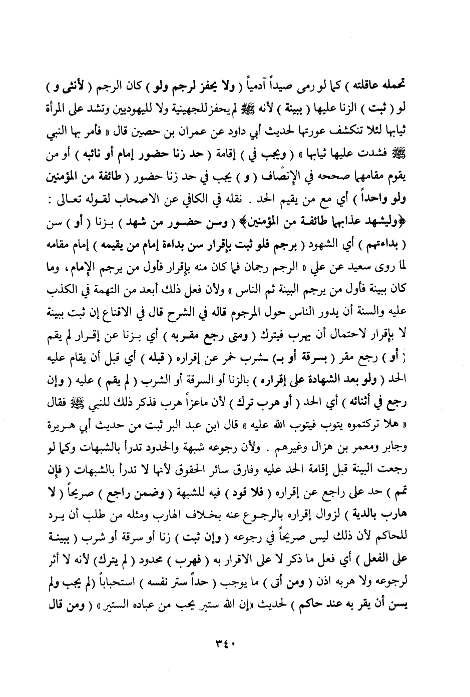 (وَيَجِبُ فِي) إقَامَةِ (حَدِّ زِنًا حُضُورُ إمَامٍ أَوْ نَائِبِهِ) أَوْ مَنْ يَقُومُ مَقَامَهُمَا صَحَّحَهُ فِي الْإِنْصَافِ (وَ) يَجِبُ فِي حَدِّ زِنًا حُضُورُ (طَائِفَةٍ مِنْ الْمُؤْمِنِينَ وَلَوْ وَاحِدًا) أَيْ: مَعَ مَنْ يُقِيمُ الْحَدَّ. نَقَلَهُ فِي الْكَافِي عَنْ الْأَصْحَابِ لِقَوْلِهِ تَعَالَى: {وَلْيَشْهَدْ عَذَابَهُمَا طَائِفَةٌ مِنْ الْمُؤْمِنِينَ} [النور: ٢] (وَسُنَّ حُضُورُ مَنْ شَهِدَ) بِزِنًا (أَوْ) سُنَّ (بُدَاءَتُهُمْ) أَيْ الشُّهُودِ (بِرَجْمٍ فَلَوْ ثَبَتَ بِإِقْرَارٍ سُنَّ بُدَاءَةُ إمَامِ مَنْ يُقِيمُهُ) إمَامٌ مَقَامَهُ ; لِمَا رَوَى سَعِيدٌ عَنْ عَلِيٍّ ": الرَّجْمُ رَجَمَانِ فَمَا كَانَ مِنْهُ بِإِقْرَارٍ فَأَوَّلُ مَنْ يَرْجُمُ الْإِمَامُ، وَمَا كَانَ بِبَيِّنَةٍ فَأَوَّلُ مَنْ يَرْجُمُ الْبَيِّنَةُ ثُمَّ النَّاسُ " وَلِأَنَّ فِعْلَ ذَلِكَ أَبْعَدُ مِنْ التُّهْمَةِ فِي الْكَذِبِ عَلَيْهِ، وَالسُّنَّةُ أَنْ يَدُورَ النَّاسُ حَوْلَ الْمَرْجُومِ قَالَهُ فِي الشَّرْحِ قَالَ فِي الْإِقْنَاعِ إنْ ثَبَتَ بِبَيِّنَةٍ لَا بِإِقْرَارٍ لِاحْتِمَالِ أَنْ يَهْرَبَ فَيُتْرَكَ