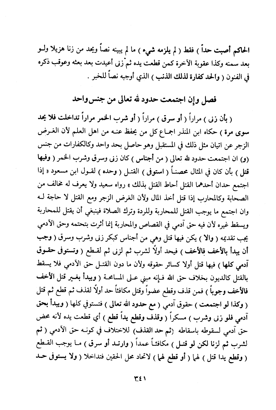 وَإِنْ اجْتَمَعَتْ حُدُودٌ لِلَّهِ تَعَالَى مِنْ جِنْسٍ وَاحِدٍ (بِأَنْ زَنَى) مِرَارًا (أَوْ سَرَقَ) مِرَارًا (أَوْ شَرِبَ الْخَمْرَ مِرَارًا تَدَاخَلَتْ فَلَا يُحَدُّ سِوَى مَرَّةٍ) حَكَاهُ ابْنُ الْمُنْذِرِ إجْمَاعَ كُلِّ مَنْ يَحْفَظُ عَنْهُ مِنْ أَهْلِ الْعِلْمِ ; لِأَنَّ الْغَرَضَ الزَّجْرُ عَنْ إتْيَانِ مِثْلِ ذَلِكَ فِي الْمُسْتَقْبَلِ، وَهُوَ حَاصِلٌ بِحَدٍّ وَاحِدٍ وَكَالْكَفَّارَاتِ مِنْ جِنْسٍ