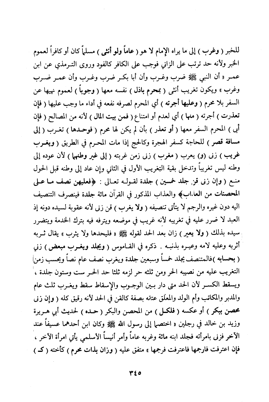 لِلْخَبَرِ (وَغُرِّبَ) إلَى مَا يَرَاهُ الْإِمَامُ لَا هُوَ (عَامًا وَلَوْ أُنْثَى) مُسْلِمًا كَانَ أَوْ كَافِرًا لِعُمُومِ الْخَبَرِ وَلِأَنَّهُ تَرَتَّبَ عَلَى الزَّانِي فَوَجَبَ عَلَى الْكَافِرِ كَالْقَوَدِ وَرَوَى التِّرْمِذِيُّ عَنْ ابْنِ عُمَرَ «أَنَّ النَّبِيَّ صَلَّى اللَّهُ عَلَيْهِ وَسَلَّمَ ضَرَبَ وَغَرَّبَ» وَأَنَّ أَبَا بَكْرٍ ضَرَبَ وَغَرَّبَ وَأَنَّ عُمَرَ ضَرَبَ وَغَرَّبَ "، وَيَكُونُ تَغْرِيبُ أُنْثَى (بِمَحْرَمٍ بَاذِلٍ) نَفْسَهُ مَعَهَا (وُجُوبًا) لِعُمُومِ نَهْيِهَا عَنْ السَّفَرِ بِلَا مَحْرَمٍ (وَعَلَيْهَا أُجْرَتُهُ) أَيْ: الْمَحْرَمِ لِصَرْفِهِ نَفْعَهُ فِي أَدَاءِ مَا وَجَبَ عَلَيْهَا (فَإِنْ تَعَذَّرَتْ) أُجْرَتُهُ (مِنْهَا) أَيْ: لِعَدَمٍ أَوْ امْتِنَاعٍ (فَمِنْ بَيْتِ الْمَالِ) لِأَنَّهُ مِنْ الْمَصَالِحِ (فَإِنْ أَبَى) الْمَحْرَمُ السَّفَرَ مَعَهَا (أَوْ تَعَذَّرَ) بِأَنْ لَمْ يَكُنْ لَهَا مَحْرَمٌ (فَوَحْدَهَا) تُغَرَّبُ (إلَى مَسَافَةِ قَصْرٍ) لِلْحَاجَةِ كَسَفَرِ الْهِجْرَةِ وَكَالْحَجِّ إذَا مَاتَ الْمَحْرَمُ فِي الطَّرِيقِ (وَيُغَرَّبُ غَرِيبٌ) زَنَى.