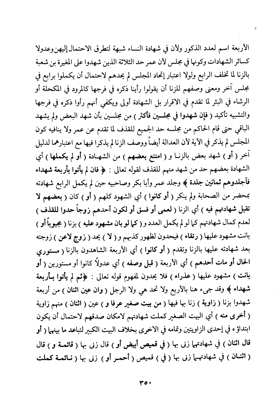 الْأَرْبَعَةَ اسْمٌ لِعَدَدِ الذُّكُورِ وَلِأَنَّ فِي شَهَادَةِ النِّسَاءِ شُبْهَةً لِتَطَرُّقِ الِاحْتِمَالِ إلَيْهِنَّ وَعُدُولًا كَسَائِرِ الشَّهَادَاتِ وَكَوْنِهَا فِي مَجْلِسٍ لِأَنَّ عُمَرَ حَدَّ الثَّلَاثَةَ الَّذِينَ شَهِدُوا عَلَى الْمُغِيرَةِ بْنِ شُعْبَةَ بِالزِّنَا لَمَّا تَخَلَّفَ الرَّابِعُ، وَلَوْلَا اعْتِبَارُ اتِّحَادُ الْمَجْلِسِ لَمْ يَحُدَّهُمْ لِاحْتِمَالِ أَنْ يُكَمَّلُوا بِرَابِعٍ فِي مَجْلِسٍ آخَرَ، وَمَعْنَى وَصْفِهِمْ لِلزِّنَا أَنْ يَقُولُوا رَأَيْنَا ذَكَرَهُ فِي فَرْجِهَا كَالْمِرْوَدِ فِي الْمُكْحُلَةِ أَوْ الرِّشَاءِ فِي الْبِئْرِ لِمَا تَقَدَّمَ فِي الْإِقْرَارِ، بَلْ الشَّهَادَةُ أَوْلَى وَيَكْفِي أَنَّهُمْ رَأَوْا ذَكَرَهُ فِي فَرْجِهَا، وَالتَّشْبِيهُ تَأْكِيدٌ (فَإِنْ شَهِدُوا فِي مَجْلِسَيْنِ فَأَكْثَرَ) مِنْ مَجْلِسَيْنِ بِأَنْ شَهِدَ الْبَعْضُ وَلَمْ يَشْهَدْ الْبَاقِي حَتَّى قَامَ الْحَاكِمُ مِنْ مَجْلِسِهِ حُدَّ الْجَمِيعُ لِلْقَذْفِ، لِمَا تَقَدَّمَ عَنْ عُمَرَ وَلَا يُنَافِيهِ كَوْنُ الْمَجْلِسِ لَمْ يُذْكَرْ فِي الْآيَةِ، لِأَنَّ الْعَدَالَةَ أَيْضًا وَوَصْفَ الزِّنَا لَمْ يُذْكَرَا فِيهَا، مَعَ اعْتِبَارِهِمَا لِدَلِيلٍ آخَرَ.