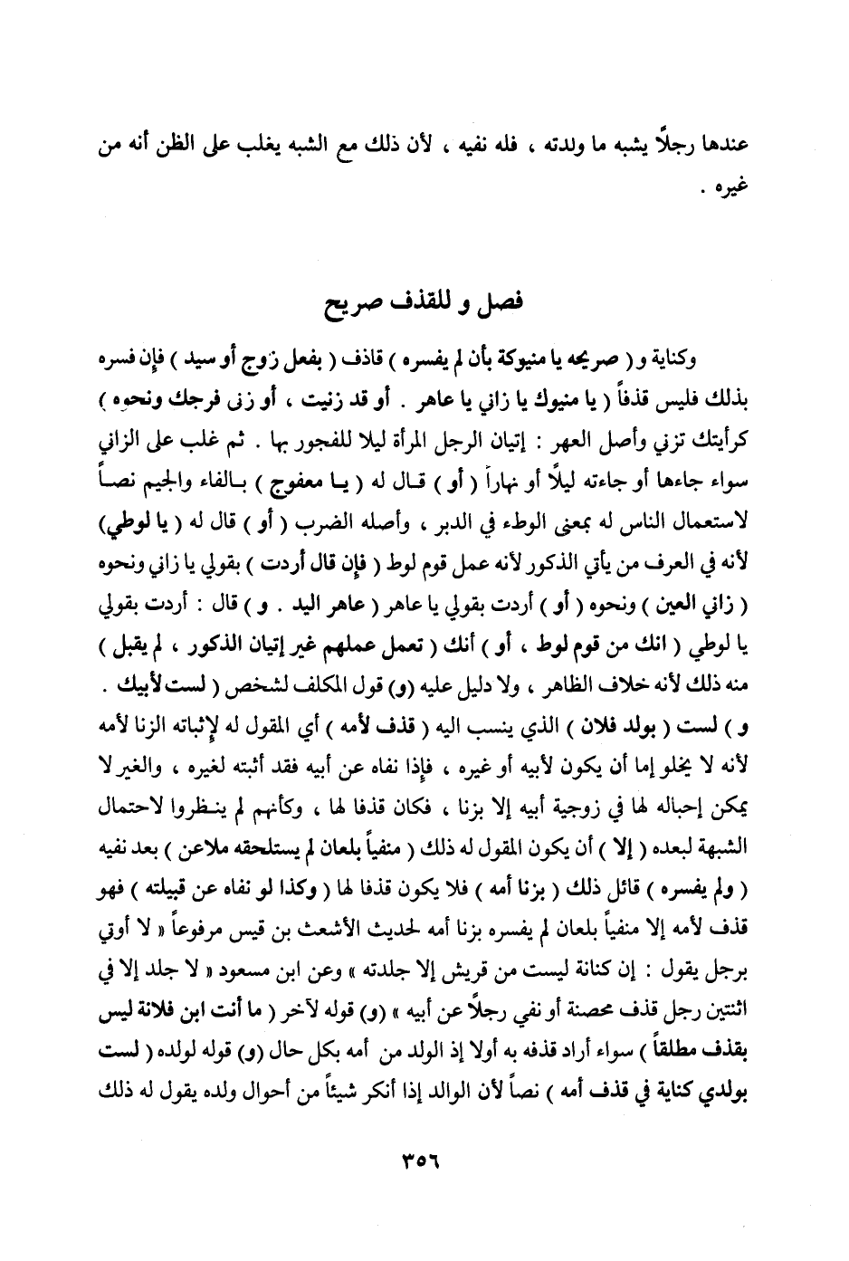 فَصْلٌ وَلِلْقَذْفِ صَرِيحٌ وَكِنَايَةٌ وَ (صَرِيحُهُ: يَا مَنْيُوكَةُ، بِأَنْ لَمْ يُفَسِّرْهُ) قَاذِفٌ (بِفِعْلِ زَوْجٍ أَوْ سَيِّدٍ) فَإِنْ فَسَّرَهُ بِذَلِكَ فَلَيْسَ قَذْفًا (يَا مَنْيُوكُ، يَا زَانِي، يَا عَاهِرُ. أَوْ قَدْ زَنَيْت، أَوْ زَنَى فَرْجُك وَنَحْوُهُ) كَرَأَيْتُك تَزْنِي، وَأَصْلُ الْعِهْرِ: إتْيَانُ الرَّجُلِ الْمَرْأَةَ لَيْلًا لِلْفُجُورِ بِهَا. ثُمَّ غَلَبَ عَلَى الزَّانِي سَوَاءٌ جَاءَهَا أَوْ جَاءَتْهُ لَيْلًا أَوْ نَهَارًا (أَوْ) قَالَ لَهُ (يَا مَعْفُوجَ) بِالْفَاءِ وَالْجِيمِ نَصًّا لِاسْتِعْمَالِ النَّاسِ لَهُ بِمَعْنَى الْوَطْءِ فِي الدُّبُرِ، وَأَصْلُهُ الضَّرْبُ (أَوْ) قَالَ لَهُ (يَا لُوطِيُّ) لِأَنَّهُ فِي الْعُرْفِ مَنْ يَأْتِي الذُّكُورَ لِأَنَّهُ عَمَلُ قَوْمِ لُوطٍ (فَإِنْ قَالَ أَرَدْت) بِقَوْلِي يَا زَانِي وَنَحْوَهُ (زَانِيَ الْعَيْنِ) وَنَحْوَهُ (أَوْ) أَرَدْت بِقَوْلِي يَا عَاهِرُ (عَاهِرَ الْيَدِ. وَ) قَالَ: أَرَدْت بِقَوْلِي يَا لُوطِيُّ (أَنَّك مِنْ قَوْمِ لُوطٍ، أَوْ) أَنَّك (تَعْمَلُ عَمَلَهُمْ غَيْرَ إتْيَانِ الذُّكُورِ، لَمْ يُقْبَلْ) مِنْهُ ذَلِكَ لِأَنَّهُ خِلَافُ الظَّاهِرِ، وَلَا دَلِيلَ عَلَيْهِ.