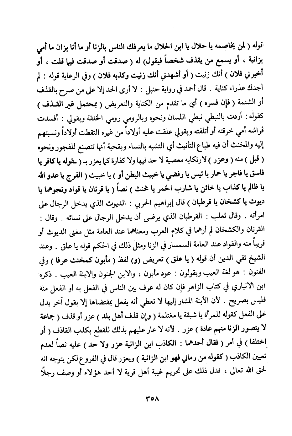 قَالَ أَحْمَدُ فِي رِوَايَةِ حَنْبَلٍ: لَا أَرَى الْحَدَّ إلَّا عَلَى مَنْ صَرَّحَ بِالْقَذْفِ أَوْ الشِّتْمَةِ (فَإِنْ فَسَّرَهُ) أَيْ: مَا تَقَدَّمَ مِنْ الْكِنَايَةِ وَالتَّعْرِيضِ (بِمُحْتَمَلٍ غَيْرِ الْقَذْفِ) كَقَوْلِهِ: أَرَدْت بِالنَّبَطِيِّ نَبَطِيَّ اللِّسَانِ وَنَحْوَهُ، وَبِالرُّومِيِّ رُومِيَّ الْخِلْقَةِ، وَبِقَوْلِي: أَفْسَدْت فِرَاشَهُ أَيْ خَرَقْته أَوْ أَتْلَفْته، وَبِقَوْلِي عَلَّقْت عَلَيْهِ أَوْلَادًا مِنْ غَيْرِهِ الْتَقَطْت أَوْلَادًا وَنَسَبْتهمْ إلَيْهِ، وَالْمُخَنَّثِ أَنَّ فِيهِ طِبَاعَ التَّأْنِيثِ أَيْ التَّشَبُّهِ بِالنِّسَاءِ، وَبِقَحْبَةٍ: أَنَّهَا تَتَصَنَّعُ لِلْفُجُورِ وَنَحْوِهِ (قُبِلَ) مِنْهُ (وَعُزِّرَ) لِارْتِكَابِهِ مَعْصِيَةً لَا حَدَّ فِيهَا وَلَا كَفَّارَةَ كَمَا يُعَزَّرُ بِ (قَوْلِهِ: يَا كَافِرُ يَا فَاسِقُ يَا فَاجِرُ يَا حِمَارُ يَا تَيْسُ يَا رَافِضِيُّ يَا خَبِيثَ الْبَطْنِ أَوْ) يَا خَبِيثَ (الْفَرْجِ يَا عَدُوَّ اللَّهِ يَا ظَالِمُ يَا كَذَّابُ يَا خَائِنُ يَا شَارِبَ الْخَمْرِ يَا مُخَنَّثُ) نَصًّا (يَا قَرْنَانُ يَا قَوَّادُ وَنَحْوُهُمَا يَا دَيُّوثُ يَا كَشْخَانُ يَا قْرْطُبَانُ) قَالَ إبْرَاهِيمُ الْحَرْبِيُّ: الدَّيُّوثُ الَّذِي يُدْخِلُ الرِّجَالَ عَلَى امْرَأَتِهِ. وَقَالَ ثَعْلَبٌ: الْقَرْطُبَانُ الَّذِي يَرْضَى أَنْ يَدْخُلَ الرِّجَالُ عَلَى نِسَائِهِ. وَقَالَ: الْقَرْنَانُ وَالْكَشْخَانُ لَمْ أَرَهُمَا فِي كَلَامِ الْعَرَبِ وَمَعْنَاهُمَا عِنْدَ الْعَامَّةِ مِثْلُ مَعْنَى الدَّيُّوثِ أَوْ قَرِيبًا مِنْهُ وَالْقَوَّادُ عِنْدَ الْعَامَّةِ السِّمْسَارُ فِي الزِّنَا وَمِثْلُ ذَلِكَ فِي الْحُكْمِ قَوْلُهُ يَا عِلْقُ. وَعِنْدَ الشَّيْخِ تَقِيِّ الدِّينِ أَنَّ قَوْلَهُ (يَا عِلْقُ) تَعْرِيضٌ (وَ) لَفْظُ (مَأْبُونٍ كَمُخَنَّثٍ عُرْفًا) .