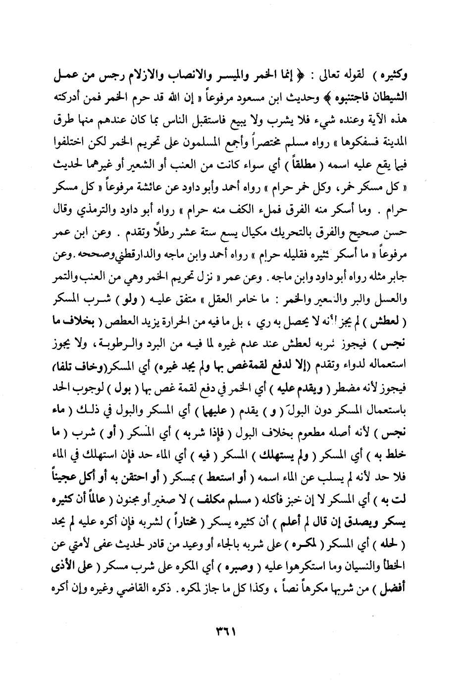 وَكَثِيرِهِ) لِقَوْلِهِ تَعَالَى: {إنَّمَا الْخَمْرُ وَالْمَيْسِرُ وَالْأَنْصَابُ وَالْأَزْلَامُ رِجْسٌ مِنْ عَمَلِ الشَّيْطَانِ فَاجْتَنِبُوهُ} [المائدة: ٩٠] وَحَدِيثِ ابْنِ مَسْعُودٍ مَرْفُوعًا «إنَّ اللَّهَ قَدْ حَرَّمَ الْخَمْرَ فَمَنْ أَدْرَكَتْهُ هَذِهِ الْآيَةُ وَعِنْدَهُ شَيْءٌ فَلَا يَشْرَبْ وَلَا يَبِعْ فَاسْتَقْبَلَ النَّاسُ بِمَا كَانَ عِنْدَهُمْ مِنْهَا طُرُقَ الْمَدِينَةِ فَسَفَكُوهَا» رَوَاهُ مُسْلِمٌ مُخْتَصَرًا وَأَجْمَعَ الْمُسْلِمُونَ عَلَى تَحْرِيمِ الْخَمْرِ لَكِنْ اخْتَلَفُوا فِيمَا يَقَعُ عَلَيْهِ اسْمُهُ (مُطْلَقًا) أَيْ سَوَاءٌ كَانَتْ مِنْ الْعِنَبِ أَوْ الشَّعِيرِ أَوْ غَيْرِهِمَا لِحَدِيثِ «كُلُّ مُسْكِرٍ خَمْرٌ، وَكُلُّ خَمْرٍ حَرَامٌ» رَوَاهُ أَحْمَدُ وَأَبُو دَاوُد.