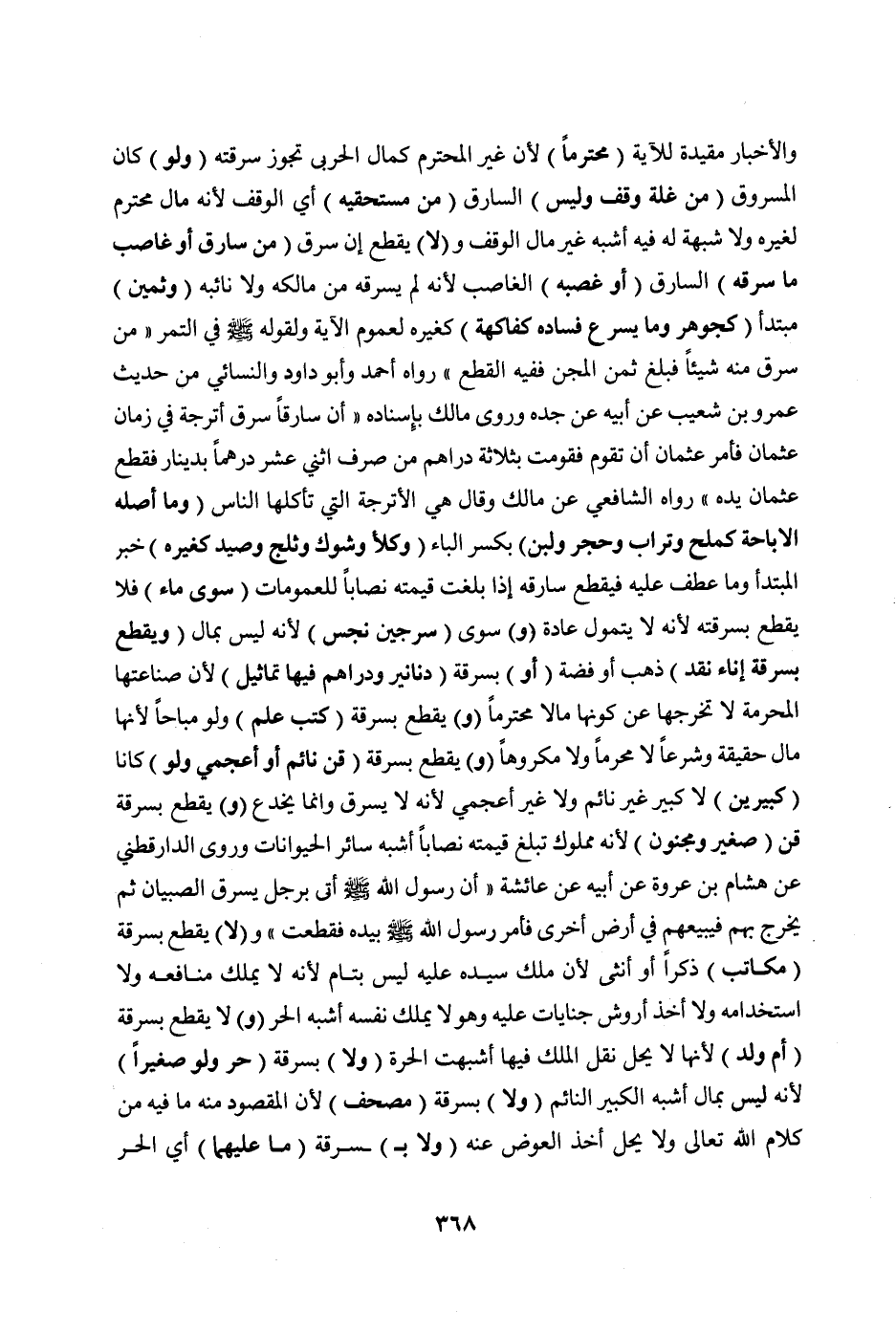 وَالْأَخْبَارُ مُقَيِّدَةٌ لِلْآيَةِ (مُحْتَرَمًا) لِأَنَّ غَيْرَ الْمُحْتَرَمِ كَمَالِ الْحَرْبِيِّ تَجُوزُ سَرِقَتُهُ (وَلَوْ) كَانَ الْمَسْرُوقُ (مِنْ غَلَّةِ وَقْفٍ وَلَيْسَ) السَّارِقُ (مِنْ مُسْتَحِقِّيهِ) أَيْ الْوَقْفِ لِأَنَّهُ مَالٌ مُحْتَرَمٌ لِغَيْرِهِ وَلَا شُبْهَةَ لَهُ فِيهِ أَشْبَهَ غَيْرَ مَالِ الْوَقْفِ وَ (لَا) يُقْطَعُ إنْ سَرَقَ (مِنْ سَارِقٍ أَوْ غَاصِبٍ مَا سَرَقَهُ) السَّارِقُ (أَوْ غَصَبَهُ) الْغَاصِبُ لِأَنَّهُ لَمْ يَسْرِقْهُ مِنْ مَالِكِهِ وَلَا نَائِبِهِ (وَثَمِينٌ) مُبْتَدَأٌ (كَجَوْهَرٍ وَمَا يُسْرِعُ فَسَادُهُ كَفَاكِهَةٍ) كَغَيْرِهِ لِعُمُومِ الْآيَةِ وَلِقَوْلِهِ صَلَّى اللَّهُ عَلَيْهِ وَسَلَّمَ «فِي التَّمْرِ مَنْ سَرَقَ مِنْهُ شَيْئًا فَبَلَغَ ثَمَنَ الْمِجَنِّ فَفِيهِ الْقَطْعُ» رَوَاهُ أَحْمَدُ وَأَبُو دَاوُد وَالنَّسَائِيُّ مِنْ حَدِيثِ عَمْرِو بْنِ شُعَيْبٍ عَنْ أَبِيهِ عَنْ جَدِّهِ.