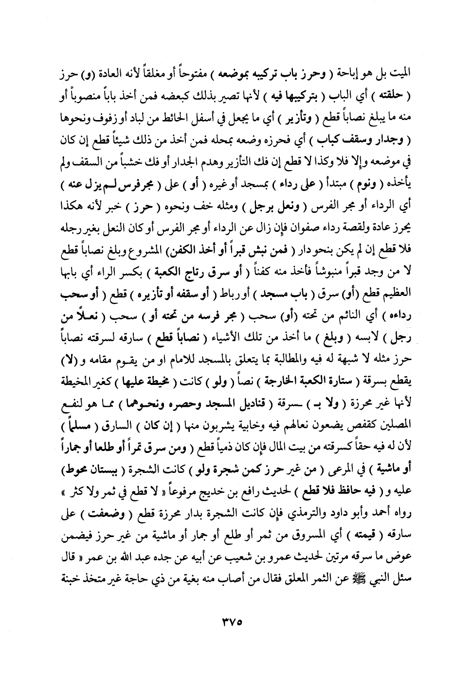 (وَمَنْ سَرَقَ تَمْرًا أَوْ طَلْعًا أَوْ جُمَّارًا أَوْ مَاشِيَةً) فِي الْمَرْعَى (مِنْ غَيْرِ حِرْزٍ كَمِنْ شَجَرَةٍ وَلَوْ) كَانَتْ الشَّجَرَةُ (بِبُسْتَانٍ مُحَوَّطٍ) عَلَيْهِ وَ (فِيهِ حَافِظٌ فَلَا قَطْعَ) لِحَدِيثِ رَافِعِ بْنِ خَدِيجٍ مَرْفُوعًا «لَا قَطْعَ فِي ثَمَرٍ وَلَا كَثَرٍ» رَوَاهُ أَحْمَدُ وَأَبُو دَاوُد وَالتِّرْمِذِيُّ فَإِنْ كَانَتْ الشَّجَرَةُ بِدَارٍ مُحْرِزَةٍ قُطِعَ