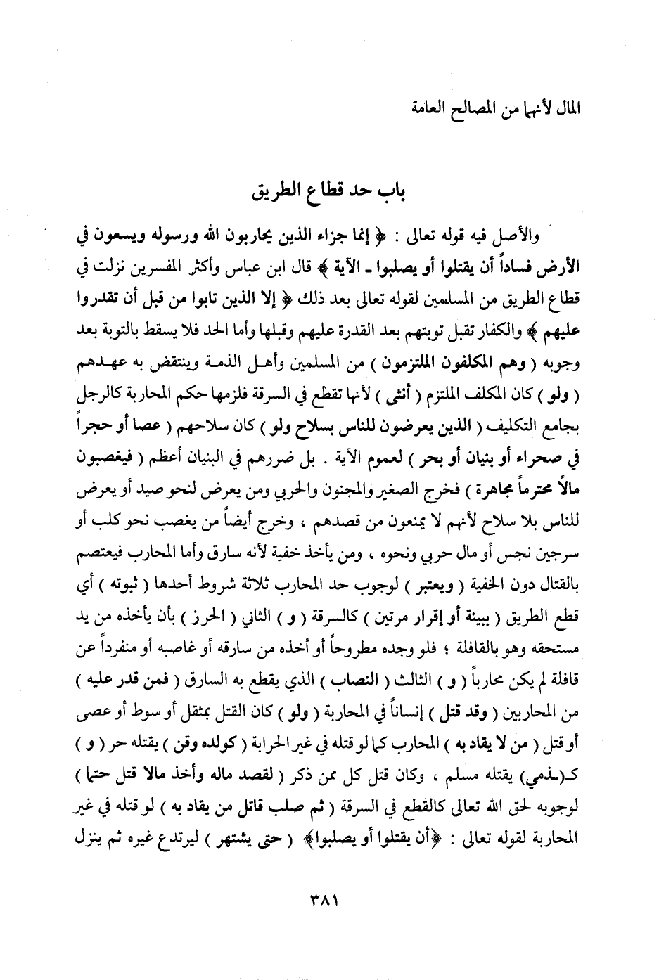 قَالَ ابْنُ عَبَّاسٍ وَأَكْثَرُ الْمُفَسِّرِينَ: نَزَلَتْ فِي قُطَّاعِ الطَّرِيقِ مِنْ الْمُسْلِمِينَ، لِقَوْلِهِ تَعَالَى بَعْدَ ذَلِكَ {إلَّا الَّذِينَ تَابُوا مِنْ قَبْلِ أَنْ تَقْدِرُوا عَلَيْهِمْ} [المائدة: ٣٤] وَالْكُفَّارُ تُقْبَلُ تَوْبَتُهُمْ بَعْدَ الْقُدْرَةِ عَلَيْهِمْ وَقَبْلَهَا وَأَمَّا الْحَدُّ فَلَا يَسْقُطُ بِالتَّوْبَةِ بَعْدَ وُجُوبِهِ (وَهُمْ الْمُكَلَّفُونَ الْمُلْتَزِمُونَ) مِنْ الْمُسْلِمِينَ وَأَهْلِ الذِّمَّةِ وَيُنْتَقَضُ بِهِ عَهْدُهُمْ (وَلَوْ) كَانَ الْمُكَلَّفُ الْمُلْتَزِمُ (أُنْثَى) لِأَنَّهَا تُقْطَعُ فِي السَّرِقَةِ فَلَزِمَهَا حُكْمُ الْمُحَارَبَةِ كَالرَّجُلِ بِجَامِعِ التَّكْلِيفِ (الَّذِينَ يَعْرِضُونَ لِلنَّاسِ بِسِلَاحٍ وَلَوْ) كَانَ سِلَاحُهُمْ (عَصًا أَوْ حَجَرًا فِي صَحْرَاءَ أَوْ بُنْيَانٍ أَوْ بَحْرٍ) لِعُمُومِ الْآيَةِ. بَلْ ضَرَرُهُمْ فِي الْبُنْيَانِ أَعْظَمُ (فَيَغْصِبُونَ مَالًا مُحْتَرَمًا مُجَاهَرَةً) فَخَرَجَ الصَّغِيرُ وَالْمَجْنُونُ وَالْحَرْبِيُّ وَمَنْ يَعْرِضُ لِنَحْوِ صَيْدٍ أَوْ يَعْرِضُ لِلنَّاسِ بِلَا سِلَاحٍ، لِأَنَّهُمْ لَا يُمْنَعُونَ مِنْ قَصْدِهِمْ، وَخَرَجَ أَيْضًا مَنْ يَغْصِبُ نَحْوَ كَلْبٍ أَوْ سِرْجِينٍ نَجِسٍ أَوْ مَالِ حَرْبِيٍّ وَنَحْوِهِ، وَمَنْ يَأْخُذُ خِفْيَةً لِأَنَّهُ سَارِقٌ وَأَمَّا الْمُحَارِبُ فَيَعْتَصِمُ بِالْقِتَالِ دُونَ الْخِفْيَةِ