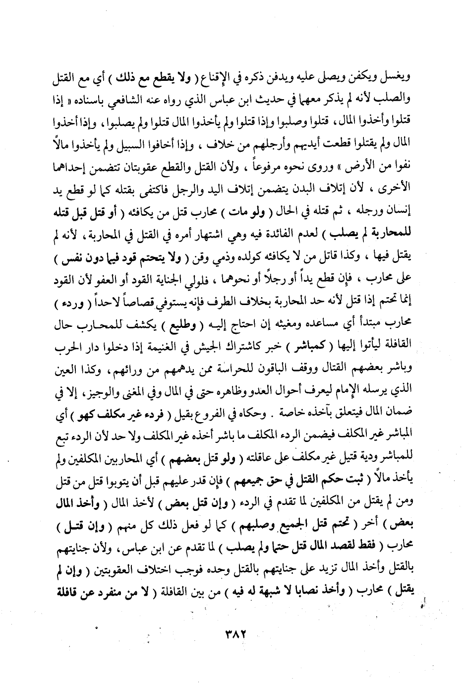 وَيُغَسَّلُ وَيُكَفَّنُ وَيُصَلَّى عَلَيْهِ وَيُدْفَنُ، ذَكَرَهُ فِي الْإِقْنَاعِ (وَلَا يُقْطَعُ مَعَ ذَلِكَ) أَيْ: مَعَ الْقَتْلِ وَالصَّلْبِ لِأَنَّهُ لَمْ يُذْكَرْ مَعَهُمَا فِي حَدِيثِ ابْنِ عَبَّاسٍ الَّذِي رَوَاهُ عَنْهُ الشَّافِعِيُّ بِإِسْنَادِهِ " إذَا قَتَلُوا وَأَخَذُوا الْمَالَ، قُتِّلُوا وَصُلِّبُوا وَإِذَا قَتَلُوا وَلَمْ يَأْخُذُوا الْمَالَ قُتِّلُوا وَلَمْ يُصَلَّبُوا، وَإِذَا أَخَذُوا الْمَالَ وَلَمْ يَقْتُلُوا قُطِّعَتْ أَيْدِيهِمْ وَأَرْجُلُهُمْ مِنْ خِلَافٍ، وَإِذَا أَخَافُوا السَّبِيلَ وَلَمْ يَأْخُذُوا مَالًا نُفُوا مِنْ الْأَرْضِ " وَرَوَى نَحْوَهُ مَرْفُوعًا، وَلِأَنَّ الْقَتْلَ وَالْقَطْعَ عُقُوبَتَانِ تَتَضَمَّنُ إحْدَاهُمَا الْأُخْرَى، لِأَنَّ إتْلَافَ الْبَدَنِ يَتَضَمَّنُ إتْلَافَ الْيَدِ وَالرِّجْلِ، فَاكْتُفِيَ بِقَتْلِهِ كَمَا لَوْ قَطَعَ يَدَ إنْسَانٍ وَرِجْلَهُ، ثُمَّ قَتَلَهُ فِي الْحَالِ