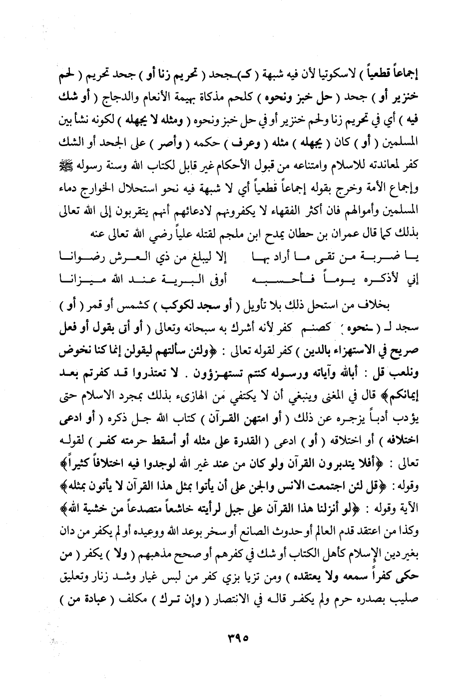 . بِخِلَافِ مَنْ اسْتَحَلَّ ذَلِكَ بِلَا تَأْوِيلٍ (أَوْ سَجَدَ لِكَوْكَبٍ) كَشَمْسٍ أَوْ قَمَرٍ (أَوْ) سَجَدَ لِ (نَحْوِهِ) كَصَنَمٍ كَفَرَ لِأَنَّهُ أَشْرَكَ بِهِ سُبْحَانَهُ وَتَعَالَى (أَوْ أَتَى بِقَوْلٍ أَوْ فِعْلٍ صَرِيحٍ فِي الِاسْتِهْزَاءِ بِالدِّينِ) كَفَرَ لِقَوْلِهِ تَعَالَى: {وَلَئِنْ سَأَلْتَهُمْ لَيَقُولُنَّ إنَّمَا كُنَّا نَخُوضُ وَنَلْعَبُ قُلْ أَبِاَللَّهِ وَآيَاتِهِ وَرَسُولِهِ كُنْتُمْ تَسْتَهْزِئُونَ لَا تَعْتَذِرُوا قَدْ كَفَرْتُمْ بَعْدَ إيمَانِكُمْ} [التوبة: ٦٥] قَالَ فِي الْمُغْنِي وَيَنْبَغِي أَنْ لَا يُكْتَفَى مِنْ الْهَازِئِ بِذَلِكَ بِمُجَرَّدِ الْإِسْلَامِ حَتَّى يُؤَدَّبَ أَدَبًا يَزْجُرُهُ عَنْ ذَلِكَ (أَوْ امْتَهَنَ الْقُرْآنَ) كِتَابَ اللَّهِ جَلَّ ذِكْرُهُ (أَوْ ادَّعَى اخْتِلَافَهُ) أَوْ اخْتِلَاقَهُ (أَوْ) ادَّعَى (الْقُدْرَةَ عَلَى مِثْلِهِ أَوْ أَسْقَطَ حُرْمَتَهُ كَفَرَ) ; لِقَوْلِهِ تَعَالَى: {أَفَلَا يَتَدَبَّرُونَ الْقُرْآنَ وَلَوْ كَانَ مِنْ عِنْدِ غَيْرِ اللَّهِ لَوَجَدُوا فِيهِ اخْتِلَافًا كَثِيرًا} [النساء: ٨٢] وَقَوْلِهِ: {قُلْ لَئِنْ اجْتَمَعَتْ الْإِنْسُ وَالْجِنُّ عَلَى أَنْ يَأْتُوا بِمِثْلِ هَذَا الْقُرْآنِ لَا يَأْتُونَ بِمِثْلِهِ} [الإسراء: ٨٨] الْآيَةَ وَقَوْلِهِ: {لَوْ أَنْزَلْنَا هَذَا الْقُرْآنَ عَلَى جَبَلٍ لَرَأَيْتَهُ خَاشِعًا مُتَصَدِّعًا مِنْ خَشْيَةِ اللَّهِ} [الحشر: ٢١] وَكَذَا مَنْ اعْتَقَدَ قِدَمَ الْعَالَمِ أَوْ حُدُوثَ الصَّانِعِ أَوْ سَخِرَ بِوَعْدِ اللَّهِ وَوَعِيدِهِ أَوْ لَمْ يُكَفِّرْ مَنْ دَانَ بِغَيْرِ دِينِ الْإِسْلَامِ كَأَهْلِ الْكِتَابِ أَوْ شَكَّ فِي كُفْرِهِمْ أَوْ صَحَّحَ مَذْهَبَهُمْ