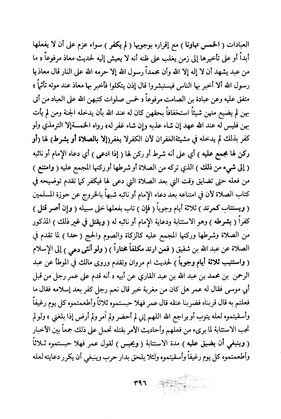 وَعَنْ عُبَادَةَ بْنِ الصَّامِتِ مَرْفُوعًا «خَمْسُ صَلَوَاتٍ كَتَبَهُنَّ اللَّهُ عَلَى الْعِبَادِ مَنْ أَتَى بِهِنَّ لَمْ يُضَيِّعْ مِنْهُنَّ شَيْئًا اسْتِخْفَافًا بِحَقِّهِنَّ كَانَ لَهُ عِنْدَ اللَّهِ بِأَنْ يُدْخِلَهُ الْجَنَّةَ وَمَنْ لَمْ يَأْتِ بِهِنَّ فَلَيْسَ لَهُ عِنْدَ اللَّهِ عَهْدٌ إنْ شَاءَ عَذَّبَهُ وَإِنْ شَاءَ غَفَرَ لَهُ» رَوَاهُ الْخَمْسَةُ إلَّا التِّرْمِذِيَّ وَلَوْ كَفَرَ بِذَلِكَ لَمْ يُدْخِلْهُ فِي مَشِيئَةِ الْغُفْرَانِ لِأَنَّ الْكُفْرَ لَا يُغْفَرُ (إلَّا بِالصَّلَاةِ أَوْ بِشَرْطٍ) لَهَا (أَوْ رُكْنٍ لَهَا مُجْمَعٍ عَلَيْهِ) أَيْ: عَلَى أَنَّهُ شَرْطٌ أَوْ رُكْنٌ لَهَا (إذَا اُدُّعِيَ) أَيْ: دَعَاهُ الْإِمَامُ أَوْ نَائِبُهُ (إلَى شَيْء مِنْ ذَلِكَ) الَّذِي تَرَكَهُ مِنْ الصَّلَاةِ أَوْ شَرْطِهَا أَوْ رُكْنِهَا الْمُجْمَعِ عَلَيْهِ (وَامْتَنَعَ) مِنْ فِعْلِهِ حَتَّى تَضَايَقَ وَقْتُ الَّتِي بَعْدَ الصَّلَاةِ الَّتِي دُعِيَ لَهَا فَيُكَفَّرُ كَمَا تَقَدَّمَ تَوْضِيحُهُ فِي كِتَابِ الصَّلَاةِ لِأَنَّ فِي امْتِنَاعِهِ بَعْدَ دُعَاءِ الْإِمَامِ أَوْ نَائِبِهِ شَبَهًا بِالْخُرُوجِ عَنْ حَوْزَةِ الْمُسْلِمِينَ (وَيُسْتَتَابُ كَمُرْتَدٍّ) ثَلَاثَةَ أَيَّامٍ وُجُوبًا (فَإِنْ) تَابَ بِفِعْلِهَا خَلَّى سَبِيلَهُ (وَإِنْ أَصَرَّ قُتِلَ) كُفْرًا (بِشَرْطِهِ) وَهُوَ الِاسْتِتَابَةُ وَدِعَايَةُ الْإِمَامِ أَوْ نَائِبِهِ لَهُ (وَيُقْتَلُ فِي غَيْرِ ذَلِكَ) الْمَذْكُورِ مِنْ الصَّلَاةِ وَشَرْطِهَا وَرُكْنِهَا الْمُجْمَعِ عَلَيْهِ كَالزَّكَاةِ وَالصَّوْمِ وَالْحَجِّ (حَدًّا) لِمَا تَقَدَّمَ فِي الصَّلَاةِ عَنْ عَبْدِ اللَّهِ بْنِ شَقِيقٍ