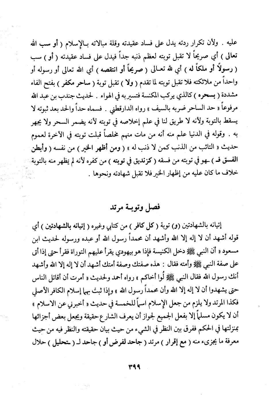 فَصْلٌ وَتَوْبَةُ مُرْتَدٍّ إتْيَانُهُ بِالشَّهَادَتَيْنِ (وَ) تَوْبَةُ (كُلِّ كَافِرٍ) مِنْ كِتَابِيٍّ وَغَيْرِهِ (إتْيَانُهُ بِالشَّهَادَتَيْنِ) أَيْ: قَوْلِهِ: أَشْهَدُ أَنْ لَا إلَهَ إلَّا اللَّهُ وَأَشْهَدُ أَنَّ مُحَمَّدًا رَسُولُ اللَّهِ، أَوْ عَبْدُهُ وَرَسُولُهُ لِحَدِيثِ ابْنِ مَسْعُودٍ «أَنَّ النَّبِيَّ صَلَّى اللَّهُ عَلَيْهِ وَسَلَّمَ دَخَلَ الْكَنِيسَةَ فَإِذَا هُوَ بِيَهُودِيٍّ يَقْرَأُ عَلَيْهِمْ التَّوْرَاةَ فَقَرَأَ حَتَّى إذَا أَتَى عَلَى صِفَةِ النَّبِيِّ صَلَّى اللَّهُ عَلَيْهِ وَسَلَّمَ وَأُمَّتِهِ فَقَالَ: هَذِهِ صِفَتُك وَصِفَةُ أُمَّتِك أَشْهَدُ أَنْ لَا إلَهَ إلَّا اللَّهُ وَأَشْهَدُ أَنَّك رَسُولُ اللَّهِ، فَقَالَ النَّبِيُّ صَلَّى اللَّهُ عَلَيْهِ وَسَلَّمَ: لُوا أَخَاكُمْ» رَوَاهُ أَحْمَدُ وَلِحَدِيثِ «أُمِرْت أَنْ أُقَاتِلَ النَّاسَ حَتَّى يَشْهَدُوا أَنْ لَا إلَهَ إلَّا اللَّهُ وَأَنَّ مُحَمَّدًا رَسُولُ اللَّهِ» وَإِذَا ثَبَتَ بِهِمَا إسْلَامُ الْكَافِرِ الْأَصْلِيِّ فَكَذَا الْمُرْتَدُّ وَلَا يَلْزَمُ مَنْ جَعَلَ الْإِسْلَامَ اسْمًا لِلْخَمْسَةِ فِي حَدِيثِ " أَخْبِرْنِي عَنْ الْإِسْلَامِ " أَنْ لَا يَكُونَ مُسْلِمًا إلَّا بِفِعْلِ الْجَمِيعِ لِجَوَازِ أَنْ يَعْرِفَ الشَّارِعُ حَقِيقَةً وَيَجْعَلَ بَعْضَ أَجْزَائِهَا بِمَنْزِلَتِهَا فِي الْحُكْمِ فَفُرِّقَ بَيْنَ النَّظَرِ فِي الشَّيْء مِنْ حَيْثُ بَيَانُ حَقِيقَتِهِ وَالنَّظَرِ فِيهِ مِنْ حَيْثُ مَعْرِفَةُ مَا يُجْزِئُ مِنْهُ (مَعَ إقْرَارِ) مُرْتَدٍّ (جَاحِدٍ لِفَرْضٍ أَوْ) جَاحِدٍ لِ (تَحْلِيلِ) حَلَالٍ