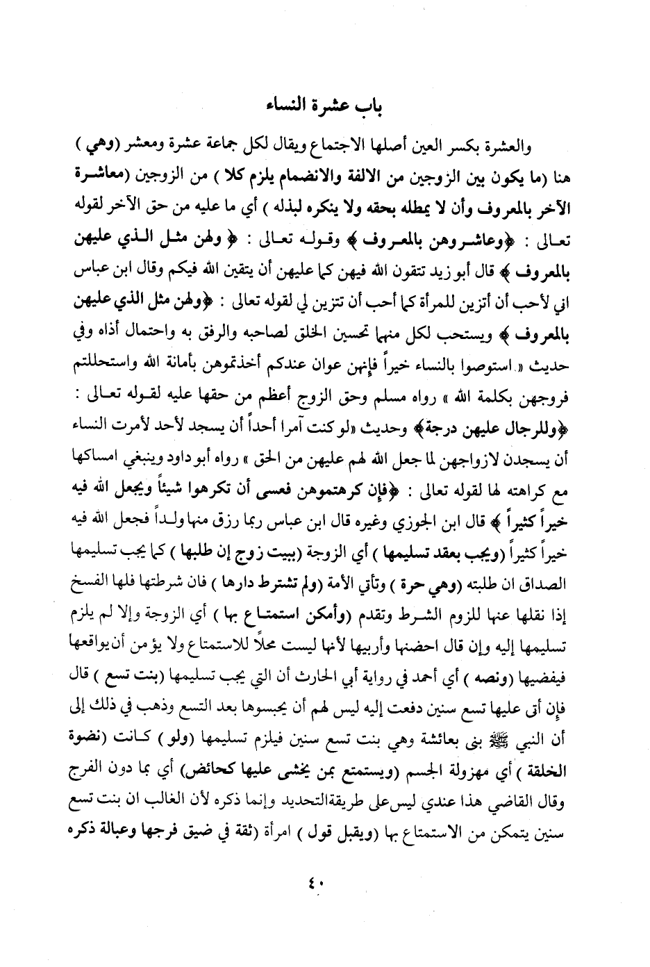 ، وَالْعِشْرَةُ بِكَسْرِ الْعَيْنِ أَصْلُهَا الِاجْتِمَاعُ، وَيُقَالُ: لِكُلِّ جَمَاعَةٍ عِشْرَةٌ وَمَعْشَرٌ (وَهِيَ) هُنَا (مَا يَكُونُ بَيْنَ الزَّوْجَيْنِ مِنْ الْأُلْفَةِ وَالِانْضِمَامِ يَلْزَمُ كُلًّا) مِنْ الزَّوْجَيْنِ (مُعَاشَرَةُ الْآخَرِ بِالْمَعْرُوفِ، وَأَنْ لَا يَمْطُلَهُ بِحَقِّهِ وَلَا يُنْكِرَهُ لِبَذْلِهِ) أَيْ: مَا عَلَيْهِ مِنْ حَقِّ الْآخَرِ لِقَوْلِهِ تَعَالَى: {وَعَاشِرُوهُنَّ بِالْمَعْرُوفِ} [النساء: ١٩] ، وقَوْله تَعَالَى: {وَلَهُنَّ مِثْلُ الَّذِي عَلَيْهِنَّ بِالْمَعْرُوفِ} [البقرة: ٢٢٨] .