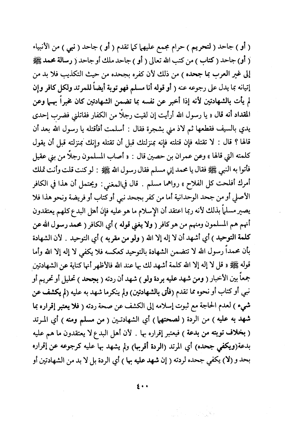 (أَوْ) جَاحِدٍ (لِتَحْرِيمِ) حَرَامٍ مُجْمَعٍ عَلَيْهِمَا كَمَا تَقَدَّمَ (أَوْ) جَاحِدِ (نَبِيٍّ) مِنْ الْأَنْبِيَاءِ (أَوْ) جَاحِدِ (كِتَابٍ) مِنْ كُتُبِ اللَّهِ تَعَالَى (أَوْ) جَاحِدِ مَلَكٍ أَوْ جَاحِدِ (رِسَالَةِ مُحَمَّدٍ صَلَّى اللَّهُ عَلَيْهِ وَسَلَّمَ إلَى غَيْرِ الْعَرَبِ بِمَا جَحَدَهُ) مِنْ ذَلِكَ لِأَنَّ كُفْرَهُ بِجَحْدِهِ مِنْ حَيْثُ التَّكْذِيبُ فَلَا بُدَّ مِنْ إتْيَانِهِ بِمَا يَدُلُّ عَلَى رُجُوعِهِ عَنْهُ.