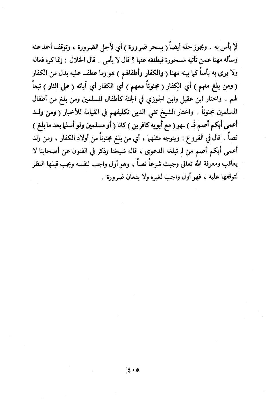 (وَالْكُفَّارُ وَأَطْفَالُهُمْ) هُوَ وَمَا عُطِفَ عَلَيْهِ بَدَلٌ مِنْ الْكُفَّارِ (وَمَنْ بَلَغَ مِنْهُمْ) أَيْ الْكُفَّارِ (مَجْنُونًا مَعَهُمْ) أَيْ الْكُفَّارِ أَيْ: آبَائِهِ (عَلَى النَّارِ) تَبَعًا لَهُمْ. وَاخْتَارَ ابْنُ عَقِيلٍ وَابْنُ الْجَوْزِيِّ فِي الْجَنَّةِ كَأَطْفَالِ الْمُسْلِمِينَ وَمَنْ بَلَغَ مِنْ أَطْفَالِ الْمُسْلِمِينَ مَجْنُونًا. وَاخْتَارَ الشَّيْخُ تَقِيُّ الدِّينِ تَكْلِيفَهُمْ فِي الْقِيَامَةِ لِلْأَخْبَارِ.