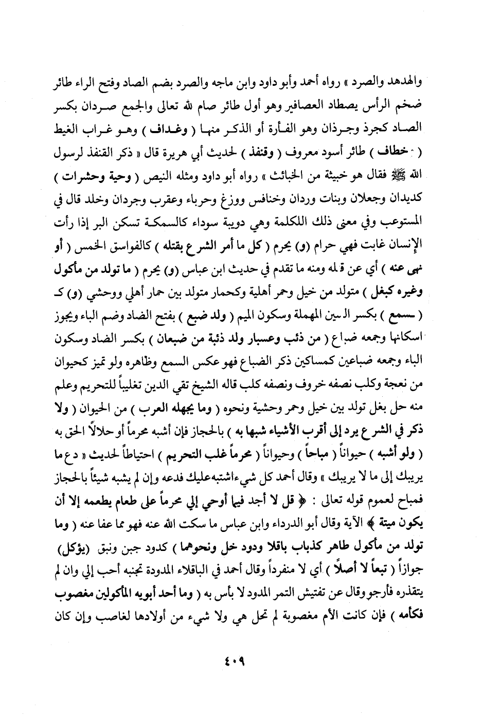 رَوَاهُ أَحْمَدُ وَأَبُو دَاوُد وَابْنُ مَاجَهْ وَالصُّرَدُ بِضَمِّ الصَّادِ وَفَتْحِ الرَّاءِ طَائِرٌ ضَخْمُ الرَّأْسِ يَصْطَادُ الْعَصَافِيرَ وَهُوَ أَوَّلُ طَائِرٍ صَامَ لِلَّهِ تَعَالَى وَالْجَمْعُ صِرْدَانُ بِكَسْرِ الصَّادِ كَجُرْذٍ وَجُرْذَانٍ وَهُوَ الْفَأْرَةُ أَوْ الذَّكَرُ مِنْهَا (وَغُدَافٍ) وَهُوَ غُرَابُ الْغَيْطِ (وَخُطَّافٍ) طَائِرٌ أَسْوَدُ مَعْرُوفٌ (وَقُنْفُذٍ) لِحَدِيثِ أَبِي هُرَيْرَةَ قَالَ «ذُكِرَ الْقُنْفُذُ لِرَسُولِ اللَّهِ صَلَّى اللَّهُ عَلَيْهِ وَسَلَّمَ فَقَالَ هُوَ خَبِيثَةٌ مِنْ الْخَبَائِثِ» رَوَاهُ أَبُو دَاوُد وَمِثْلُهُ النَّيْصُ (وَحَيَّةٍ وَحَشَرَاتٍ) كَدِيدَانٍ وَجِعْلَانٍ وَبَنَاتِ وَرْدَانِ وَخَنَافِسَ وَوَزَغٍ وَحِرْبَاءَ وَعَقْرَبٍ وَجُرْدَانَ وَخُلْدٍ قَالَ فِي الْمُسْتَوْعِبِ وَفِي مَعْنَى ذَلِكَ الْكَلِمَةِ وَهِيَ دُوَيْبَّةٌ سَوْدَاءُ كَالسَّمَكَةِ تَسْكُنُ الْبَرَّ إذَا رَأَتْ الْإِنْسَانَ غَابَتْ فَهِيَ حَرَامٌ.
