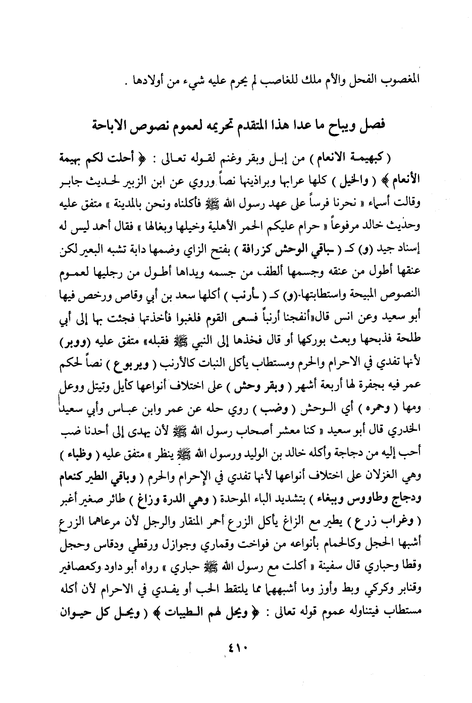 فَصْلٌ وَيُبَاحُ مَا عَدَا هَذَا الْمُتَقَدِّمَ تَحْرِيمُهُ لِعُمُومِ نُصُوصِ الْإِبَاحَةِ (كَبَهِيمَةِ الْأَنْعَامِ) مِنْ إبِلٍ وَبَقَرٍ وَغَنَمٍ لِقَوْلِهِ تَعَالَى: {أُحِلَّتْ لَكُمْ بَهِيمَةُ الْأَنْعَامِ} [المائدة: ١] (وَالْخَيْلِ) كُلِّهَا عِرَابِهَا وَبَرَاذِينِهَا نَصًّا وَرُوِيَ عَنْ ابْنِ الزُّبَيْرِ لِحَدِيثِ جَابِرٍ وَقَالَتْ أَسْمَاءُ «نَحَرْنَا فَرَسًا عَلَى عَهْدِ رَسُولِ اللَّهِ صَلَّى اللَّهُ عَلَيْهِ وَسَلَّمَ فَأَكَلْنَاهُ وَنَحْنُ بِالْمَدِينَةِ» مُتَّفَقٌ عَلَيْهِ.