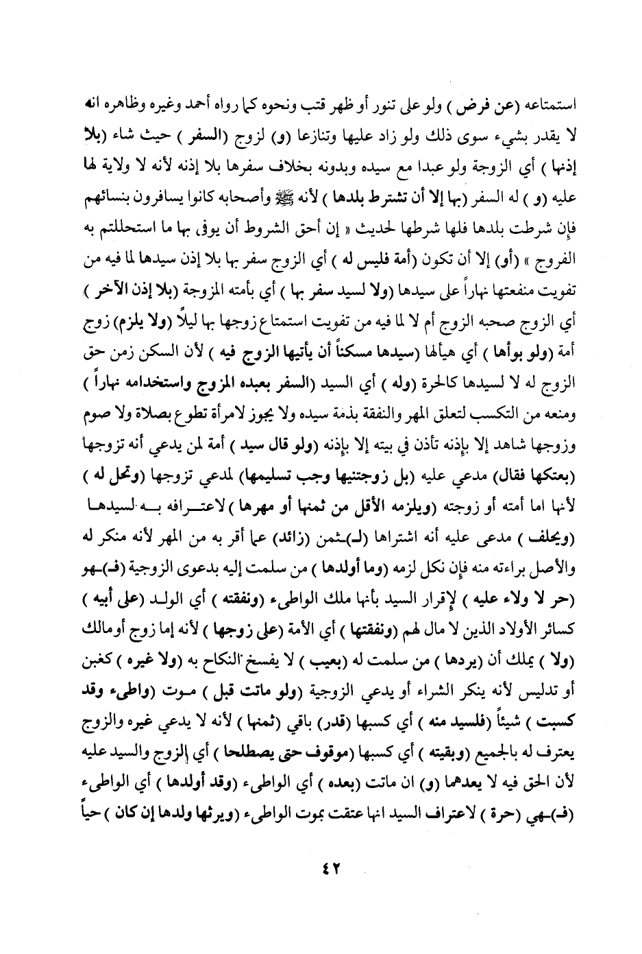 (وَ) لِزَوْجٍ (السَّفَرُ) حَيْثُ شَاءَ (بِلَا إذْنِهَا) أَيْ: الزَّوْجَةِ وَلَوْ عَبْدًا مَعَ سَيِّدِهِ، وَبِدُونِهِ بِخِلَافِ سَفَرِهَا بِلَا إذْنِهِ ; لِأَنَّهُ لَا وِلَايَةَ لَهَا عَلَيْهِ (، وَ) لَهُ السَّفَرُ (بِهَا) (إلَّا أَنْ تَشْتَرِطَ بَلَدَهَا) ; لِأَنَّهُ صَلَّى اللَّهُ عَلَيْهِ وَسَلَّمَ وَأَصْحَابُهُ كَانُوا يُسَافِرُونَ بِنِسَائِهِمْ فَإِنْ شَرَطَتْ بَلَدَهَا فَلَهَا شَرْطُهَا لِحَدِيثِ «إنَّ أَحَقَّ الشُّرُوطِ أَنْ يُوَفَّى بِهَا مَا اسْتَحْلَلْتُمْ بِهِ الْفُرُوجَ» (أَوْ) إلَّا أَنْ تَكُونَ (أَمَةً فَلَيْسَ لَهُ) أَيْ: الزَّوْجِ سَفَرٌ بِهَا بِلَا إذْنِ سَيِّدِهَا لِمَا فِيهِ مِنْ تَفْوِيتِ مَنْفَعَتِهَا نَهَارًا عَلَى سَيِّدِهَا (وَلَا لِسَيِّدٍ سَفَرٌ بِهَا) أَيْ: بِأَمَتِهِ الْمُزَوَّجَةِ (بِلَا إذْنِ الْآخَرِ) أَيْ: الزَّوْجِ صَحِبَهُ الزَّوْجُ أَمْ لَا لِمَا فِيهِ مِنْ تَفْوِيتِ اسْتِمْتَاعِ زَوْجِهَا بِهَا لَيْلًا (وَلَا يَلْزَمُ) زَوْجَ أَمَةٍ (وَلَوْ بَوَّأَهَا) أَيْ: هَيَّأَ لَهَا (سَيِّدُهَا مَسْكَنًا أَنْ يَأْتِيَهَا الزَّوْجُ فِيهِ) ; لِأَنَّ السَّكَنَ مِنْ حَقِّ الزَّوْجِ لَهُ لَا لِسَيِّدِهَا كَالْحُرَّةِ (وَلَهُ) أَيْ: السَّيِّدِ (السَّفَرُ بِعَبْدِهِ الْمُزَوَّجِ، وَاسْتِخْدَامُهُ نَهَارًا) ، وَمَنْعُهُ مِنْ التَّكَسُّبِ لِتَعَلُّقِ الْمَهْرِ، وَالنَّفَقَةِ بِذِمَّةِ سَيِّدِهِ وَلَا يَجُوزُ لِامْرَأَةٍ تَطَوُّعٌ بِصَلَاةٍ وَلَا صَوْمٍ وَزَوْجُهَا شَاهِدٌ إلَّا بِإِذْنِهِ وَلَا تَأْذَنُ فِي بَيْتِهِ إلَّا بِإِذْنِهِ.