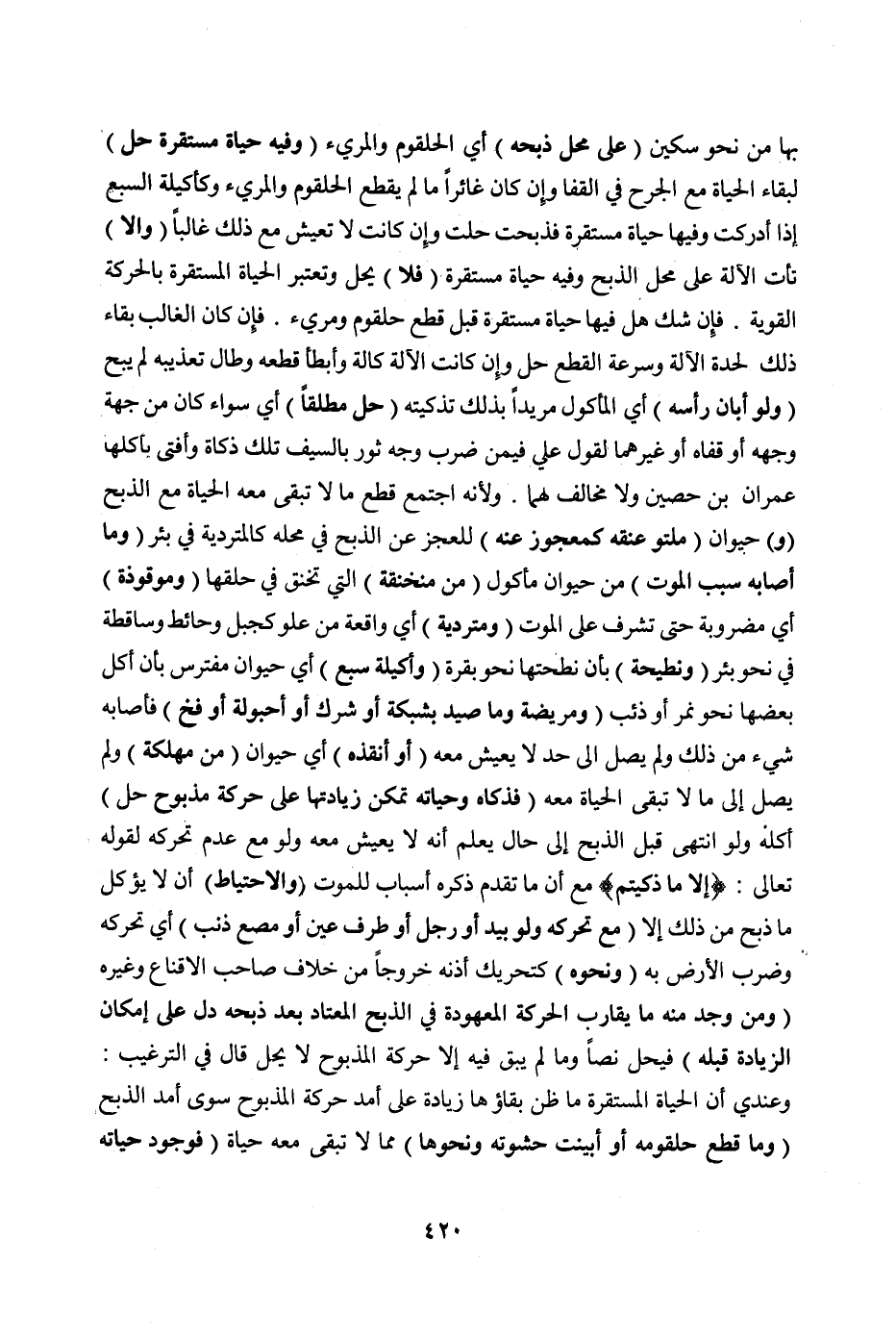 بِهَا مِنْ نَحْوِ سِكِّينٍ (عَلَى مَحَلِّ ذَبْحِهِ) أَيْ: الْحُلْقُومِ وَالْمَرِيءِ (وَفِيهِ حَيَاةٌ مُسْتَقِرَّةٌ حَلَّ) لِبَقَاءِ الْحَيَاةِ مَعَ الْجَرْحِ فِي الْقَفَا وَإِنْ كَانَ غَائِرًا مَا لَمْ يَقْطَعْ الْحُلْقُومَ وَالْمَرِيءَ وَكَأَكِيلَةِ السَّبُعِ إذَا أُدْرِكْت وَفِيهَا حَيَاةٌ مُسْتَقِرَّةٌ فَذُبِحَتْ حَلَّتْ وَإِنْ كَانَتْ لَا تَعِيشُ مَعَ ذَلِكَ غَالِبًا (وَإِلَّا) تَأْتِ الْآلَةُ عَلَى مَحَلِّ الذَّبْحِ وَفِيهِ حَيَاةٌ مُسْتَقِرَّةٌ (فَلَا) يَحِلُّ وَتُعْتَبَرُ الْحَيَاةُ الْمُسْتَقِرَّةُ بِالْحَرَكَةِ الْقَوِيَّةِ. فَإِنْ شُكَّ هَلْ فِيهَا حَيَاةٌ مُسْتَقِرَّةٌ قَبْلَ قَطْعِ حُلْقُومٍ وَمَرِيءٍ؟ فَإِنْ كَانَ الْغَالِبُ بَقَاء ذَلِكَ لِحِدَّةِ الْآلَةِ وَسُرْعَةِ الْقَطْعِ حَلَّ وَإِنْ كَانَتْ الْآلَةُ كَالَّةً وَأَبْطَأَ قَطْعُهُ وَطَالَ تَعْذِيبُهُ لَمْ يُبَحْ.