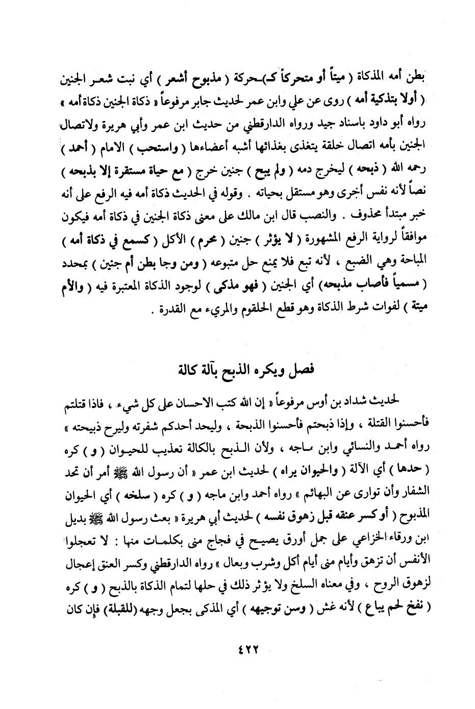 بَطْنِ أُمِّهِ الْمُذَكَّاةِ (مَيِّتًا أَوْ مُتَحَرِّكًا كَ) حَرَكَةِ (مَذْبُوحٍ أَشْعَرَ) أَيْ: نَبَتَ شَعْرُ الْجَنِينِ (أَوْ لَا بِتَذْكِيَةِ أُمِّهِ) رُوِيَ عَنْ عَلِيٍّ وَابْنِ عُمَرَ لِحَدِيثِ جَابِرٍ مَرْفُوعًا «ذَكَاةُ الْجَنِينِ ذَكَاةُ أُمِّهِ» رَوَاهُ أَبُو دَاوُد بِإِسْنَادٍ جَيِّدٍ وَرَوَاهُ الدَّارَقُطْنِيُّ مِنْ حَدِيثِ ابْنِ عُمَرَ وَأَبِي هُرَيْرَةَ وَلِاتِّصَالِ الْجَنِينِ بِأُمِّهِ اتِّصَالَ خِلْقَةٍ يَتَغَذَّى بِغِذَائِهَا أَشْبَهَ أَعْضَاءَهَا (وَاسْتَحَبَّ) الْإِمَامُ (أَحْمَدُ) رَحِمَهُ اللَّهُ (ذَبْحَهُ) لِيَخْرُجَ دَمُهُ (وَلَمْ يُبَحْ) جَنِينٌ خَرَجَ (مَعَ حَيَاةٍ مُسْتَقِرَّةٍ إلَّا بِذَبْحِهِ) نَصًّا لِأَنَّهُ نَفْسٌ أُخْرَى وَهُوَ مُسْتَقِلٌّ بِحَيَاتِهِ. وَقَوْلُهُ فِي الْحَدِيثِ ذَكَاةُ أُمِّهِ فِيهِ الرَّفْعُ عَلَى أَنَّهُ خَبَرُ مُبْتَدَإٍ مَحْذُوفٍ. وَالنَّصْبُ قَالَ ابْنُ مَالِكٍ عَلَى مَعْنَى ذَكَاةِ الْجَنِينِ فِي ذَكَاةِ أُمِّهِ فَيَكُونُ مُوَافِقًا لِرِوَايَةِ الرَّفْعِ الْمَشْهُورَةِ (لَا يُؤَثِّرُ) جَنِينٌ (مُحَرَّمُ) الْأَكْلِ (كَسَبُعٍ فِي ذَكَاةِ أُمِّهِ) الْمُبَاحَةِ وَهِيَ الضَّبُعُ، لِأَنَّهُ تَبَعٌ فَلَا يَمْنَعُ حِلَّ مَتْبُوعِهِ (وَمَنْ وَجَأَ بَطْنَ أُمِّ جَنِينٍ) بِمُحَدَّدٍ (مُسَمِّيًا فَأَصَابَ مَذْبَحَهُ) أَيْ: الْجَنِينِ (فَهُوَ مُذَكًّى) لِوُجُودِ الذَّكَاةِ الْمُعْتَبَرَةِ فِيهِ (وَالْأُمُّ مَيِّتَةٌ) لِفَوَاتِ شَرْطِ الذَّكَاةِ وَهُوَ قَطْعُ الْحُلْقُومِ وَالْمَرِيءِ مَعَ الْقُدْرَةِ.