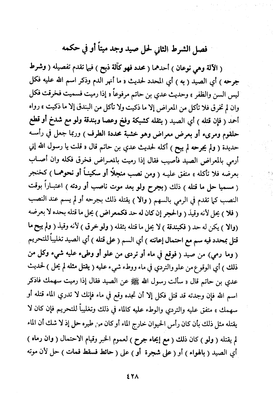 فَصْلٌ الشَّرْطُ الثَّانِي لِحِلِّ صَيْدٍ وُجِدَ مَيْتًا أَوْ فِي حُكْمِهِ (الْآلَةُ وَهِيَ نَوْعَانِ) أَحَدُهُمَا (مُحَدَّدُ فَهُوَ كَآلَةِ ذَبْحٍ) فِيمَا تَقَدَّمَ تَفْصِيلُهُ (وَشَرْطُ جَرْحِهِ) أَيْ: الصَّيْدِ (بِهِ) أَيْ: الْمُحَدَّدِ لِحَدِيثِ «مَا أَنْهَرَ الدَّمَ وَذُكِرَ اسْمُ اللَّهِ عَلَيْهِ فَكُلْ لَيْسَ السِّنَّ وَالظُّفُرَ» وَحَدِيثِ عَدِيِّ بْنِ حَاتِمٍ مَرْفُوعًا «إذَا رَمَيْتَ فَسَمَّيْتَ فَخَرَقَتْ فَكُلْ وَإِنْ لَمْ تَخْرِقْ فَلَا تَأْكُلْ مِنْ الْمِعْرَاضِ إلَّا مَا ذَكَّيْتَ وَلَا تَأْكُلْ مِنْ الْبُنْدُقِ إلَّا مَا ذَكَّيْتَ» رَوَاهُ أَحْمَدُ (فَإِنْ قَتَلَهُ) أَيْ الصَّيْدَ (بِثِقَلِهِ كَشَبَكَةٍ وَفَخٍّ وَعَصَا وَبُنْدُقَةٍ وَلَوْ مَعَ شَدْخٍ أَوْ قَطْعِ حُلْقُومٍ وَمَرِيءٍ أَوْ بِعَرْضِ مِعْرَاضٍ وَهُوَ خَشَبَةٌ مُحَدَّدَةُ الطَّرَفِ) وَرُبَّمَا جَعَلَ فِي رَأْسِهِ حَدِيدَةً (وَلَمْ يَجْرَحْهُ لَمْ يُبَحْ) أَكْلُهُ لِحَدِيثِ عَدِيِّ بْنِ حَاتِمٍ قَالَ «قُلْتُ يَا رَسُولَ اللَّهِ إنِّي أَرْمِي بِالْمِعْرَاضِ الصَّيْدَ فَأُصِيبُ فَقَالَ إذَا رَمَيْتَ بِالْمِعْرَاضِ فَخَرَقَ فَكُلْهُ وَإِنْ أَصَابَ بِعَرْضِهِ فَلَا تَأْكُلْهُ» مُتَّفَقٌ عَلَيْهِ. (وَمَنْ نَصَبَ مِنْجَلًا أَوْ سِكِّينًا أَوْ نَحْوَهُمَا) كَخِنْجَرٍ (مُسَمِّيًا حَلَّ مَا قَتَلَهُ) ذَلِكَ (بِجُرْحٍ وَلَوْ بَعْدَ مَوْتِ نَاصِبٍ أَوْ رِدَّتِهِ) اعْتِبَارًا بِوَقْتِ النَّصْبِ كَمَا تَقَدَّمَ فِي الرَّمْيِ بِالسَّهْمِ (وَإِلَّا) يَقْتُلُهُ ذَلِكَ بِجَرْحِهِ أَوْ لَمْ يُسَمِّ عِنْدَ النَّصْبِ (فَلَا) يَحِلُّ لِأَنَّهُ وَقِيذٌ (وَالْحَجَرُ إنْ كَانَ لَهُ حَدٌّ فَكَمِعْرَاضٍ) يَحِلُّ مَا قَتَلَهُ بِحَدِّهِ لَا بِعَرْضِهِ (وَإِلَّا) يَكُنْ لَهُ حَدٌّ (فَكَبُنْدُقَةٍ) لَا يَحِلُّ مَا قَتَلَهُ بِثِقَلِهِ (وَلَوْ خَرَقَ) لِأَنَّهُ وَقِيذٌ (وَلَمْ يُبَحْ مَا قُتِلَ بِمُحَدَّدٍ فِيهِ سُمٌّ مَعَ احْتِمَالِ إعَانَتِهِ) أَيْ: السُّمِّ (عَلَى قَتْلِهِ) أَيْ: الصَّيْدِ تَغْلِيبًا لِلتَّحْرِيمِ (وَمَا رُمِيَ) مِنْ صَيْدٍ (فَوَقَعَ فِي مَاءٍ أَوْ تَرَدَّى مِنْ عُلْوٍ أَوْ وَطِئَ عَلَيْهِ شَيْءٌ وَكُلٌّ مِنْ ذَلِكَ) أَيْ: الْوُقُوعُ مِنْ عُلْوٍ وَالتَّرَدِّي فِي مَاءٍ وَوَطْءِ شَيْءٍ عَلَيْهِ (يَقْتُلُ مِثْلُهُ لَمْ يَحِلَّ) لِحَدِيثِ عَدِيِّ بْنِ حَاتِمٍ قَالَ «سَأَلْتُ رَسُولَ اللَّهِ صَلَّى اللَّهُ عَلَيْهِ وَسَلَّمَ عَنْ الصَّيْدِ فَقَالَ: إذَا رَمَيْتَ سَهْمَكَ فَاذْكُرْ اسْمَ اللَّهِ فَإِنْ وَجَدْتَهُ قَدْ قَتَلَ فَكُلْ إلَّا أَنْ تَجِدَهُ وَقَعَ فِي مَاءٍ فَإِنَّكَ لَا تَدْرِي: الْمَاءُ قَتَلَهُ أَوْ سَهْمُكَ» مُتَّفَقٌ عَلَيْهِ وَالتَّرَدِّي وَالْوَطْءُ عَلَيْهِ كَالْمَاءِ فِي ذَلِكَ وَتَغْلِيبًا لِلتَّحْرِيمِ فَإِنْ كَانَ لَا يَقْتُلُهُ مِثْلُ ذَلِكَ بِأَنْ كَانَ رَأْسُ الْحَيَوَانِ خَارِجَ الْمَاءِ أَوْ كَانَ مِنْ طَيْرِهِ حَلَّ إذْ لَا شَكَّ أَنَّ الْمَاءَ لَمْ يَقْتُلْهُ (وَلَوْ) كَانَ ذَلِكَ (مَعَ إيحَاءِ جُرْحٍ) لِعُمُومِ الْخَبَرِ وَقِيَامِ الِاحْتِمَالِ (وَإِنْ رَمَاهُ) أَيْ الصَّيْدَ (بِالْهَوَاءِ) أَوْ (عَلَى شَجَرَةٍ أَوْ) عَلَى (حَائِطٍ فَسَقَطَ فَمَاتَ) حَلَّ لِأَنَّ مَوْتَهُ