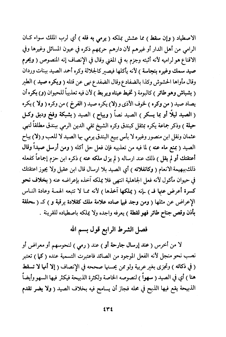 وَفِي الْإِقْنَاعِ هُوَ لِرَامِيهِ لِأَنَّهُ أَثْبَتَهُ وَجَزَمَ بِهِ فِي الْمُغْنِي وَقَالَ فِي الْإِنْصَافِ إنَّهُ الْمَنْصُوصُ (وَيَحْرُمُ صَيْدُ سَمَكٍ وَغَيْرِهِ بِنَجَاسَةٍ) لِأَنَّهُ يَأْكُلُهَا فَيَصِيرُ كَالْجَلَّالَةِ وَكَرِهَ أَحْمَدُ الصَّيْدَ بِبَنَاتِ وَرْدَانَ وَقَالَ مَأْوَاهَا الْحُشُوشُ وَكَذَا بِالضَّفَادِعِ وَقَالَ الضُّفْدَعُ نُهِيَ عَنْ قَتْلِهِ (وَيُكْرَهُ صَيْدُ) الطَّيْرِ (بَشْبَاشٍ وَهُوَ طَائِرٌ) كَالْبُومَةِ (تُخَيَّطُ عَيْنَاهُ وَيُرْبَطُ) لِأَنَّ فِيهِ تَعْذِيبًا لِلْحَيَوَانِ (وَ) يُكْرَهُ أَنْ يُصَادَ صَيْدٌ (مِنْ وَكْرِهِ) لِخَوْفِ الْأَذَى وَ (لَا) يُكْرَهُ صَيْدُ (الْفَرْخِ) مِنْ وَكْرِهِ (وَلَا) يُكْرَهُ (الصَّيْدُ لَيْلًا أَوْ بِمَا يُسْكِرُ) الصَّيْدَ نَصًّا (وَيُبَاحُ) الصَّيْدُ (بِشَبَكَةٍ وَفَخٍّ وَدِبْقٍ وَكُلِّ حِيلَةٍ) وَذَكَرَ جَمَاعَةٌ يُكْرَهُ بِمِثْقَلٍ كَبُنْدُقٍ وَكَرِهَ الشَّيْخُ تَقِيُّ الدِّينِ الرَّمْيَ بِبُنْدُقٍ مُطْلَقًا لِنَهْيِ عُثْمَانَ وَنَقَلَ ابْنُ مَنْصُورٍ وَغَيْرُهُ لَا بَأْسَ بِبَيْعِ الْبُنْدُقِ يُرْمَى بِهَا الصَّيْدُ لَا لِلَّعِبِ وَ (لَا) يُبَاحُ الصَّيْدُ (بِمَنْعِ مَاءٍ عَنْهُ) لِمَا فِيهِ مِنْ تَعْذِيبِهِ فَإِنْ فَعَلَ حَلَّ أَكْلُهُ. (وَمَنْ أَرْسَلَ صَيْدًا وَقَالَ أَعْتَقْتُك أَوْ لَمْ يَقُلْ) ذَلِكَ عِنْدَ إرْسَالٍ (لَمْ يُزَلْ مِلْكُهُ عَنْهُ) ذَكَرَهُ ابْنُ حَزْمٍ إجْمَاعًا كَفِعْلِهِ ذَلِكَ بِبَهِيمَةِ الْأَنْعَامِ (وَكَانْفِلَاتِهِ) أَيْ: الصَّيْدِ بِلَا إرْسَالٍ.