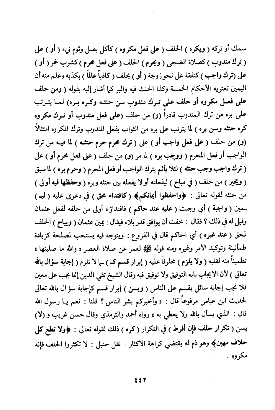 (وَيَحْرُمُ) الْحَلِفُ (عَلَى فِعْلِ مُحَرَّمٍ) كَشُرْبِ خَمْرٍ (أَوْ) عَلَى (تَرْكِ وَاجِبٍ) كَنَفَقَةٍ عَلَى نَحْوِ زَوْجَةٍ (أَوْ) يَحْلِفُ (كَاذِبًا عَالِمًا) بِكَذِبِهِ وَعُلِمَ مِنْهُ أَنَّ الْيَمِينَ تَعْتَرِيهِ الْأَحْكَامُ الْخَمْسَةُ وَكَذَا الْحِنْثُ فِيهِ وَالْبَرُّ كَمَا أَشَارَ إلَيْهِ بِقَوْلِ (وَمَنْ حَلَفَ عَلَى فِعْلِ مَكْرُوهٍ أَوْ حَلَفَ عَلَى تَرْكِ مَنْدُوبٍ سُنَّ حِنْثُهُ وَكُرِهَ بَرُّهُ) لِمَا يَتَرَتَّبُ عَلَى بِرِّهِ مِنْ تَرْكِ الْمَنْدُوبِ قَادِرًا