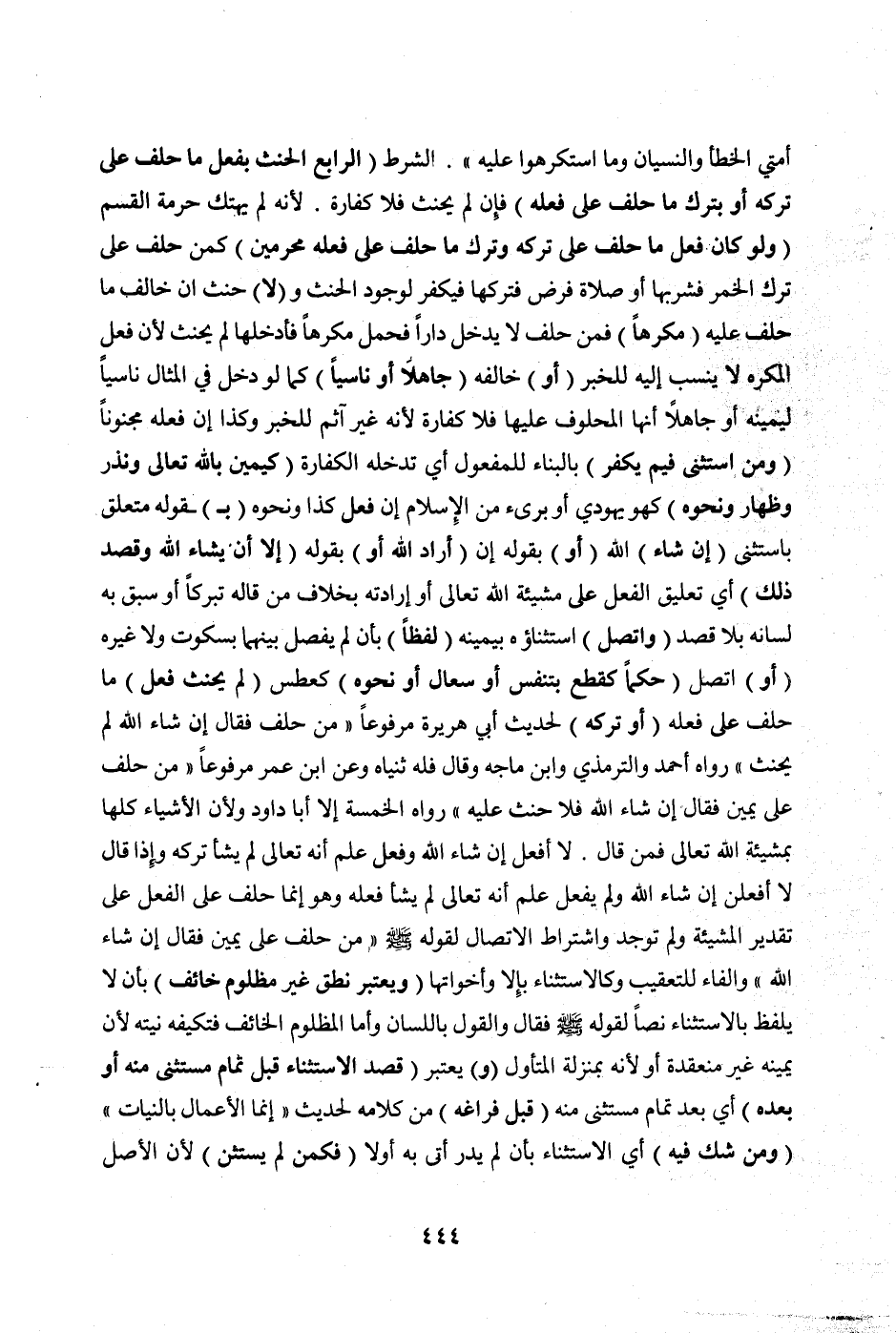 «رُفِعَ عَنْ أُمَّتِي الْخَطَأُ وَالنِّسْيَانُ وَمَا اُسْتُكْرِهُوا عَلَيْهِ» . الشَّرْطُ (الرَّابِعُ الْحِنْثُ بِفِعْلِ مَا حَلَفَ عَلَى تَرْكِهِ أَوْ بِتَرْكِ مَا حَلَفَ عَلَى فِعْلِهِ) فَإِنْ لَمْ يَحْنَثْ فَلَا كَفَّارَةَ. لِأَنَّهُ لَمْ يَهْتِكْ حُرْمَةَ الْقَسَمِ (وَلَوْ كَانَ فَعَلَ مَا حَلَفَ عَلَى تَرْكِهِ وَتَرَكَ مَا حَلَفَ عَلَى فِعْلِهِ مُحَرَّمَيْنِ) كَمَنْ حَلَفَ عَلَى تَرْكِ الْخَمْرِ فَشَرِبَهَا أَوْ صَلَاةِ فَرْضٍ فَتَرَكَهَا فَيَكْفُرُ لِوُجُودِ الْحِنْثِ.