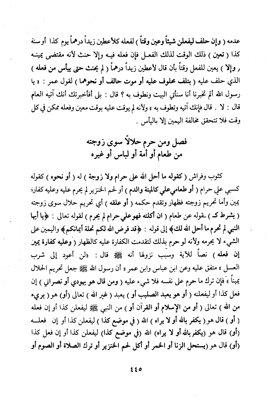 وَمَنْ حَرَّمَ حَلَالًا سِوَى زَوْجَتِهِ مِنْ طَعَامٍ أَوْ أَمَةٍ أَوْ لِبَاسٍ أَوْ غَيْرِهِ كَثَوْبٍ وَفِرَاشٍ (كَقَوْلِهِ مَا أَحَلَّ اللَّهُ عَلَيَّ حَرَامٌ وَلَا زَوْجَةَ) لَهُ (أَوْ نَحْوَهُ) كَقَوْلِهِ كَسْبِي عَلَيَّ حَرَامٌ (أَوْ طَعَامِي عَلَيَّ كَالْمَيْتَةِ وَالدَّمِ) أَوْ لَحْمِ الْخِنْزِيرِ لَمْ يَحْرُمْ عَلَيْهِ وَعَلَيْهِ كَفَّارَةُ يَمِينٍ وَأَمَّا تَحْرِيمُ زَوْجَتِهِ فَظِهَارٌ وَتَقَدَّمَ حُكْمُهُ (أَوْ عَلَّقَهُ) أَيْ: تَحْرِيمِ حَلَالٍ سِوَى زَوْجَتِهِ (بِشَرْطٍ كَ) قَوْلِهِ عَنْ طَعَامٍ (إنْ أَكَلْته فَهُوَ عَلَيَّ حَرَامٌ لَمْ يَحْرُمْ) لِقَوْلِهِ تَعَالَى: {يَا أَيُّهَا النَّبِيُّ لِمَ تُحَرِّمُ مَا أَحَلَّ اللَّهُ لَكَ} [التحريم: ١] إلَى قَوْلِهِ: {قَدْ فَرَضَ اللَّهُ لَكُمْ تَحِلَّةَ أَيْمَانِكُمْ} [التحريم: ٢] وَالْيَمِينُ عَلَى الشَّيْءِ لَا يُحَرِّمُهُ وَلِأَنَّهُ لَوْ حُرِّمَ بِذَلِكَ لَتَقَدَّمَتْ الْكَفَّارَةُ عَلَيْهِ كَالظِّهَارِ (وَعَلَيْهِ كَفَّارَةُ يَمِينٍ إنْ فَعَلَهُ) نَصًّا لِلْآيَةِ وَسَبَبُ نُزُولِهَا «أَنَّهُ صَلَّى اللَّهُ عَلَيْهِ وَسَلَّمَ قَالَ: لَنْ أَعُودَ إلَى شُرْبِ الْعَسَلِ» مُتَّفَقٌ عَلَيْهِ وَعَنْ ابْنِ عَبَّاسٍ وَابْنِ عُمَرَ «أَنَّ رَسُولَ اللَّهِ صَلَّى اللَّهُ عَلَيْهِ وَسَلَّمَ جَعَلَ تَحْرِيمَ الْحَلَالِ يَمِينًا» فَإِنْ تَرَكَ مَا حَرَّمَ عَلَى نَفْسِهِ فَلَا شَيْءَ عَلَيْهِ