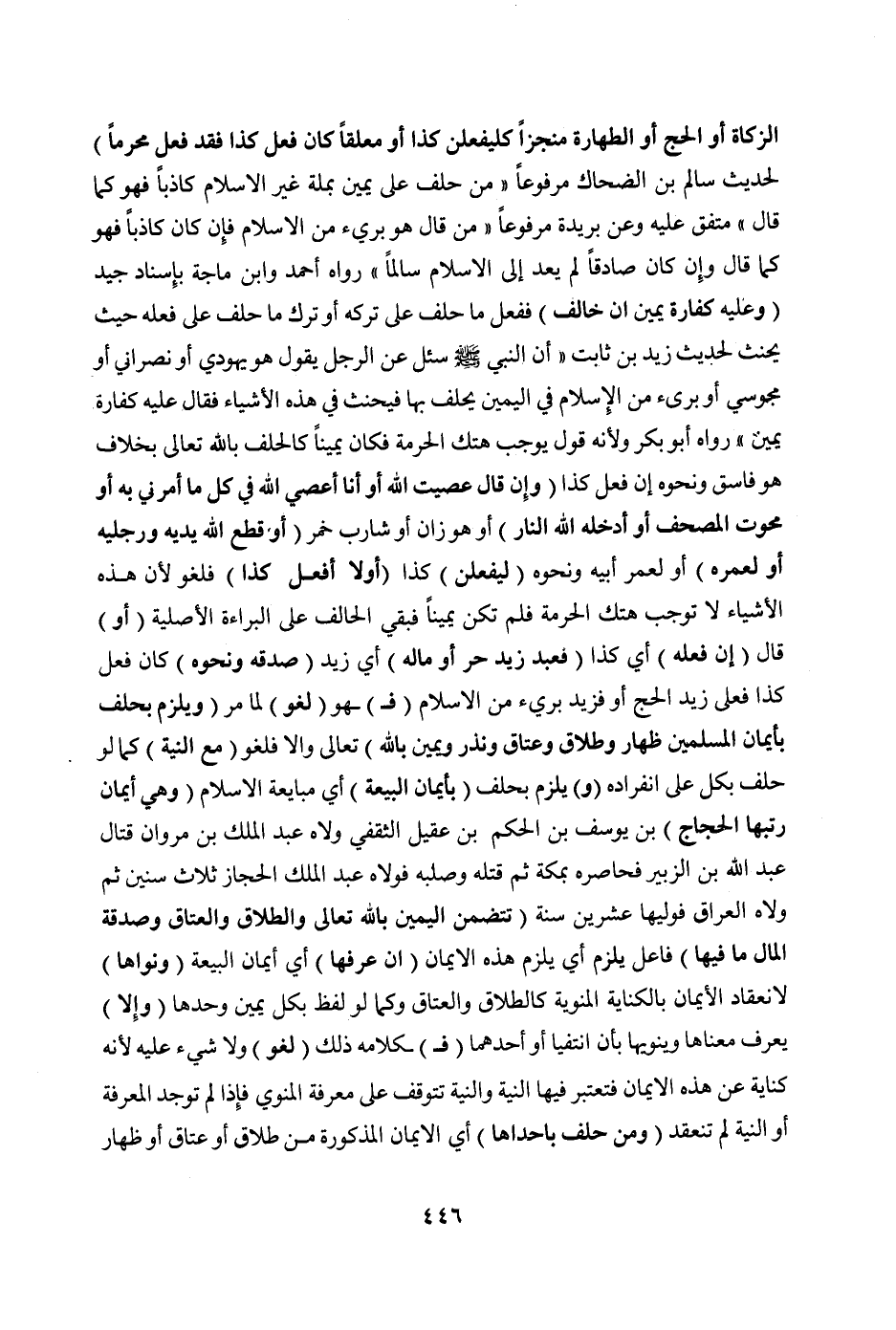 الزَّكَاةِ أَوْ الْحَجِّ أَوْ الطَّهَارَةِ مُنْجِزًا كَلَيَفْعَلَنَّ كَذَا أَوْ مُعَلِّقًا كَإِنْ فَعَلَ كَذَا فَقَدْ فَعَلَ مُحَرَّمًا) لِحَدِيثِ سَالِمِ بْنِ الضَّحَّاكِ مَرْفُوعًا «مَنْ حَلَفَ عَلَى يَمِينٍ بِمِلَّةٍ غَيْرِ الْإِسْلَامِ كَاذِبًا فَهُوَ كَمَا قَالَ» مُتَّفَقٌ عَلَيْهِ وَعَنْ بُرَيْدَةَ مَرْفُوعًا «مَنْ قَالَ هُوَ بَرِيءٌ مِنْ الْإِسْلَامِ فَإِنْ كَانَ كَاذِبًا فَهُوَ كَمَا قَالَ وَإِنْ كَانَ صَادِقًا لَمْ يَعُدْ إلَى الْإِسْلَامِ سَالِمًا» رَوَاهُ أَحْمَدُ وَابْنُ مَاجَهْ بِإِسْنَادٍ جَيِّدٍ (وَعَلَيْهِ كَفَّارَةُ يَمِينٍ إنْ خَالَفَ) فَفَعَلَ مَا حَلَفَ عَلَى تَرْكِهِ أَوْ تَرَكَ مَا حَلَفَ عَلَى فِعْلِهِ حَيْثُ يَحْنَثُ لِحَدِيثِ زَيْدِ بْنِ ثَابِتٍ «أَنَّ النَّبِيَّ صَلَّى اللَّهُ عَلَيْهِ وَسَلَّمَ سُئِلَ عَنْ الرَّجُلِ يَقُولُ هُوَ يَهُودِيٌّ أَوْ نَصْرَانِيٌّ أَوْ مَجُوسِيٌّ أَوْ بَرِئَ مِنْ الْإِسْلَامِ فِي الْيَمِينِ يَحْلِفُ بِهَا فَيَحْنَثُ فِي هَذِهِ الْأَشْيَاءِ فَقَالَ عَلَيْهِ كَفَّارَةُ يَمِينٍ» رَوَاهُ أَبُو بَكْرٍ وَلِأَنَّهُ قَوْلٌ يُوجِبُ هَتْكَ الْحُرْمَةِ فَكَانَ يَمِينًا كَالْحَلِفِ بِاَللَّهِ تَعَالَى بِخِلَافِ هُوَ فَاسِقٌ وَنَحْوِهِ إنْ فَعَلَ كَذَا