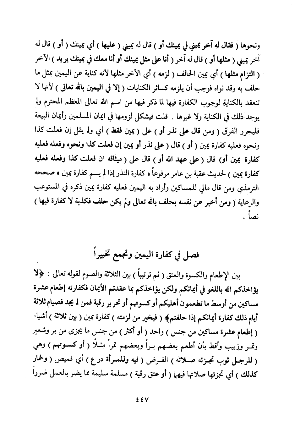 فَصْلٌ فِي كَفَّارَةِ الْيَمِينِ وَتُجْمَعُ تَخْيِيرًا بَيْنَ الْإِطْعَامِ وَالْكِسْوَةِ وَالْعِتْقِ (ثُمَّ تَرْتِيبًا) بَيْنَ الثَّلَاثَةِ وَالصَّوْمِ لِقَوْلِهِ تَعَالَى: {لَا يُؤَاخِذُكُمْ اللَّهُ بِاللَّغْوِ فِي أَيْمَانِكُمْ وَلَكِنْ يُؤَاخِذُكُمْ بِمَا عَقَّدْتُمْ الْأَيْمَانَ فَكَفَّارَتُهُ إطْعَامُ عَشَرَةِ مَسَاكِينَ مِنْ أَوْسَطِ مَا تُطْعِمُونَ أَهْلِيكُمْ أَوْ كِسْوَتُهُمْ أَوْ تَحْرِيرُ رَقَبَةٍ فَمَنْ لَمْ يَجِدْ فَصِيَامُ ثَلَاثَةِ أَيَّامٍ ذَلِكَ كَفَّارَةُ أَيْمَانِكُمْ إذَا حَلَفْتُمْ} [المائدة: ٨٩] (فَيُخَيَّرُ مَنْ لَزِمَتْهُ) كَفَّارَةُ يَمِينٍ (بَيْنَ ثَلَاثَةِ) أَشْيَاءَ (إطْعَامُ عَشَرَةِ مَسَاكِينَ مِنْ جِنْسٍ) وَاحِدٍ (أَوْ أَكْثَرَ) مِنْ جِنْسِ مَا يُجْزِي مِنْ بُرٍّ وَشَعِيرٍ وَتَمْرٍ وَزَبِيبٍ وَأَقِطٍ بِأَنْ أَطْعَمَ بَعْضَهُمْ بُرًّا وَبَعْضَهُمْ تَمْرًا مَثَلًا (أَوْ كِسْوَتُهُمْ) وَهِيَ (لِلرَّجُلِ ثَوْبٌ تُجْزِئُهُ صَلَاتُهُ) الْفَرْضَ (فِيهِ وَلِلْمَرْأَةِ دِرْعٌ) أَيْ: قَمِيصٌ (وَخِمَارٌ كَذَلِكَ) أَيْ: تُجْزِئُهَا صَلَاتُهَا فِيهِمَا (أَوْ عِتْقُ رَقَبَةٍ) مُسْلِمَةٍ سَلِيمَةٍ مِمَّا يَضُرُّ بِالْعَمَلِ ضَرَرًا