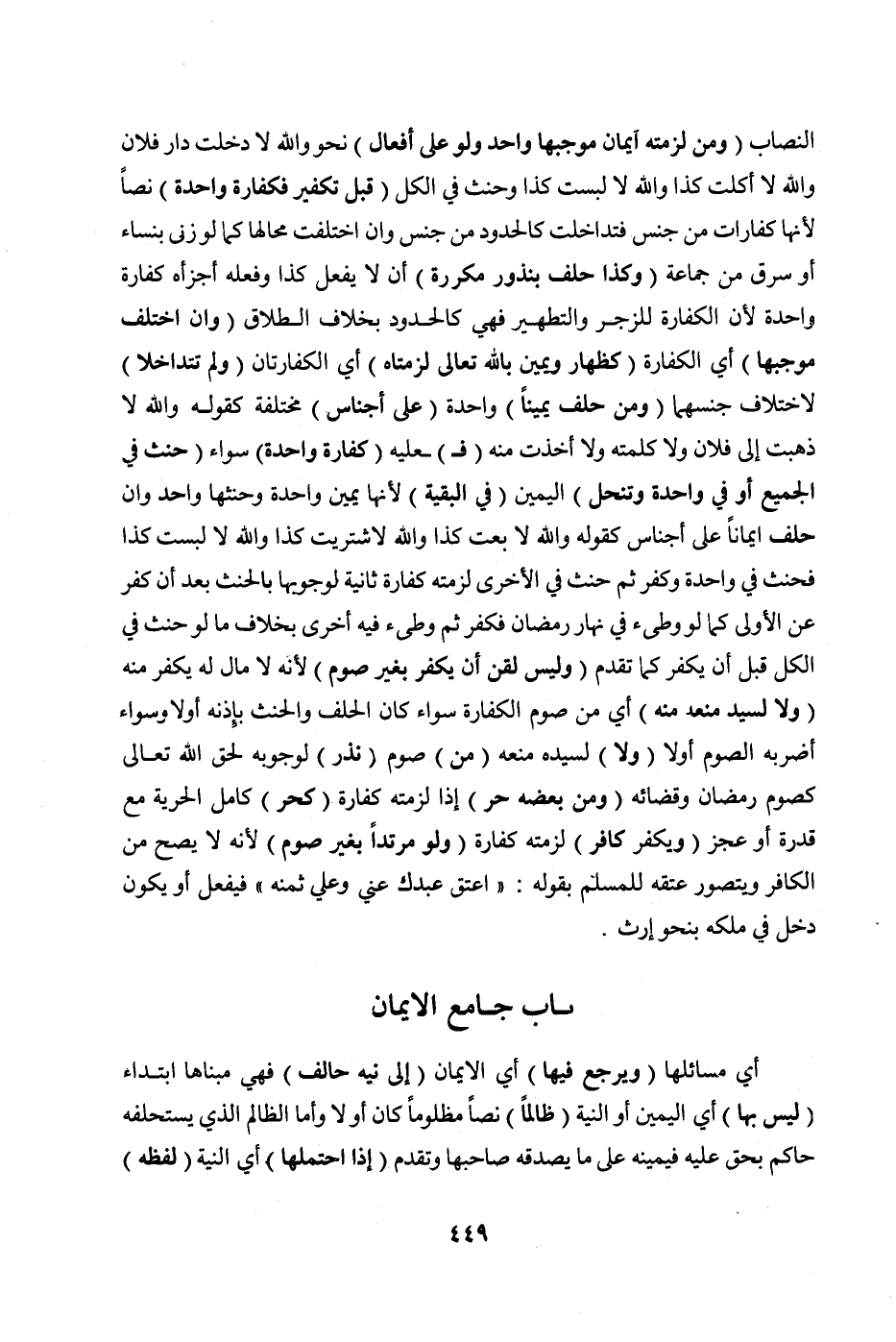 (وَمَنْ لَزِمَتْهُ أَيْمَانٌ مُوجِبُهَا وَاحِدٌ وَلَوْ عَلَى أَفْعَالٍ) نَحْوُ وَاَللَّهِ لَا دَخَلْت دَارَ فُلَانٍ وَاَللَّهِ لَا أَكَلْت كَذَا وَاَللَّهِ لَا لَبِسْت كَذَا وَحَنِثَ فِي الْكُلِّ (قَبْلَ تَكْفِيرٍ فَكَفَّارَةٌ وَاحِدَةٌ) نَصًّا لِأَنَّهَا كَفَّارَاتٌ مِنْ جِنْسٍ فَتَدَاخَلَتْ كَالْحُدُودِ مِنْ جِنْسٍ وَإِنْ اخْتَلَفَتْ مَحَالُّهَا كَمَا لَوْ زَنَى بِنِسَاءٍ أَوْ سَرَقَ مِنْ جَمَاعَةٍ (وَكَذَا حَلَفَ بِنُذُورٍ مُكَرَّرَةٍ) أَنْ لَا يَفْعَلَ كَذَا وَفَعَلَهُ أَجْزَأَهُ كَفَّارَةٌ وَاحِدَةٌ لِأَنَّ الْكَفَّارَةَ لِلزَّجْرِ وَالتَّطْهِيرِ فَهِيَ كَالْحُدُودِ بِخِلَافِ الطَّلَاقِ (وَإِنْ اخْتَلَفَ مُوجِبُهَا) أَيْ الْكَفَّارَةِ (كَظِهَارٍ وَيَمِينٍ بِاَللَّهِ تَعَالَى لَزِمَتَاهُ) أَيْ: الْكَفَّارَتَانِ (وَلَمْ تَتَدَاخَلَا) لِاخْتِلَافِ جِنْسِهِمَا