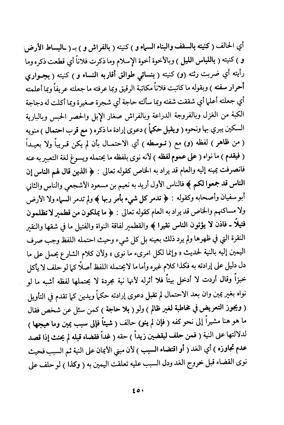 وَالنَّاسُ الثَّانِي أَبُو سُفْيَانَ وَأَصْحَابُهُ وَكَقَوْلِهِ: {تُدَمِّرُ كُلَّ شَيْءٍ بِأَمْرِ رَبِّهَا} [الأحقاف: ٢٥] وَلَمْ تُدَمِّرْ السَّمَاءَ وَلَا الْأَرْضَ وَلَا مَسَاكِنَهُمْ وَالْخَاصُّ قَدْ يُرَادُ بِهِ الْعَامُّ كَقَوْلِهِ تَعَالَى: {مَا يَمْلِكُونَ مِنْ قِطْمِيرٍ} [فاطر: ١٣] {لَا تُظْلَمُونَ فَتِيلًا} [النساء: ٧٧]- {فَإِذَنْ لَا يُؤْتُونَ النَّاسَ نَقِيرًا} [النساء: ٥٣] وَالْقِطْمِيرُ لُفَافَةُ النَّوَاةِ وَالْفَتِيلُ مَا فِي شِقِّهَا وَالنَّقِيرُ النَّقْرَةُ الَّتِي فِي ظَهْرِهَا وَلَمْ يُرِدْ ذَلِكَ بِعَيْنِهِ بَلْ كُلَّ شَيْءٍ وَحَيْثُ احْتَمَلَهُ اللَّفْظُ وَجَبَ صَرْفُ الْيَمِينِ إلَيْهِ بِالنِّيَّةِ لِحَدِيثِ «إنَّمَا لِكُلِّ امْرِئٍ مَا نَوَى» وَلِأَنَّ كَلَامَ الشَّارِعِ يُحْمَلُ عَلَى مَا دَلَّ دَلِيلٌ عَلَى إرَادَتِهِ بِهِ فَكَذَا كَلَامُ غَيْرِهِ وَأَمَّا مَا لَا يَحْتَمِلُهُ اللَّفْظُ أَصْلًا كَمَا لَوْ حَلَفَ لَا يَأْكُلُ خُبْزًا وَقَالَ أَرَدْت لَا أَدْخُلُ بَيْتًا فَلَا أَثَرَ لَهُ لِأَنَّهَا نِيَّةٌ مُجَرَّدَةٌ لَا يَحْتَمِلُهَا لَفْظُهُ أَشْبَهَ مَا لَوْ نَوَاهُ بِغَيْرِ يَمِينٍ وَإِنْ بَعُدَ الِاحْتِمَالُ لَمْ تُقْبَلْ دَعْوَى إرَادَتِهِ حُكْمًا وَيَدِينُ كَمَا تَقَدَّمَ فِي التَّأْوِيلِ